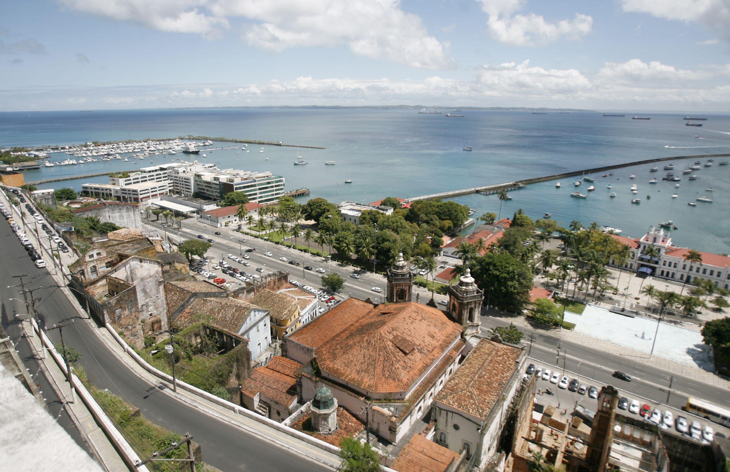 Vista da Cidade Baixa de Salvador pelo mirante do Elevador Lacerda. Ao lado, a maior concentração de construções coloniais do Brasil está na capital baiana.
