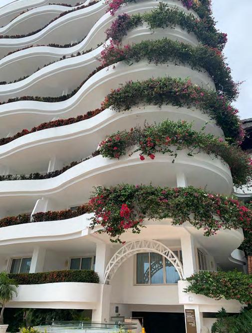 Rooftop do resort (ao lado) conta com uma vista incrível do pacífico com psicina de borda infinita; arquitetura encantadora: o colorido das flores em lindo contraste com o branco das varandas (ao lado e acima); todos os quartos contam com vista para o mar (acima)