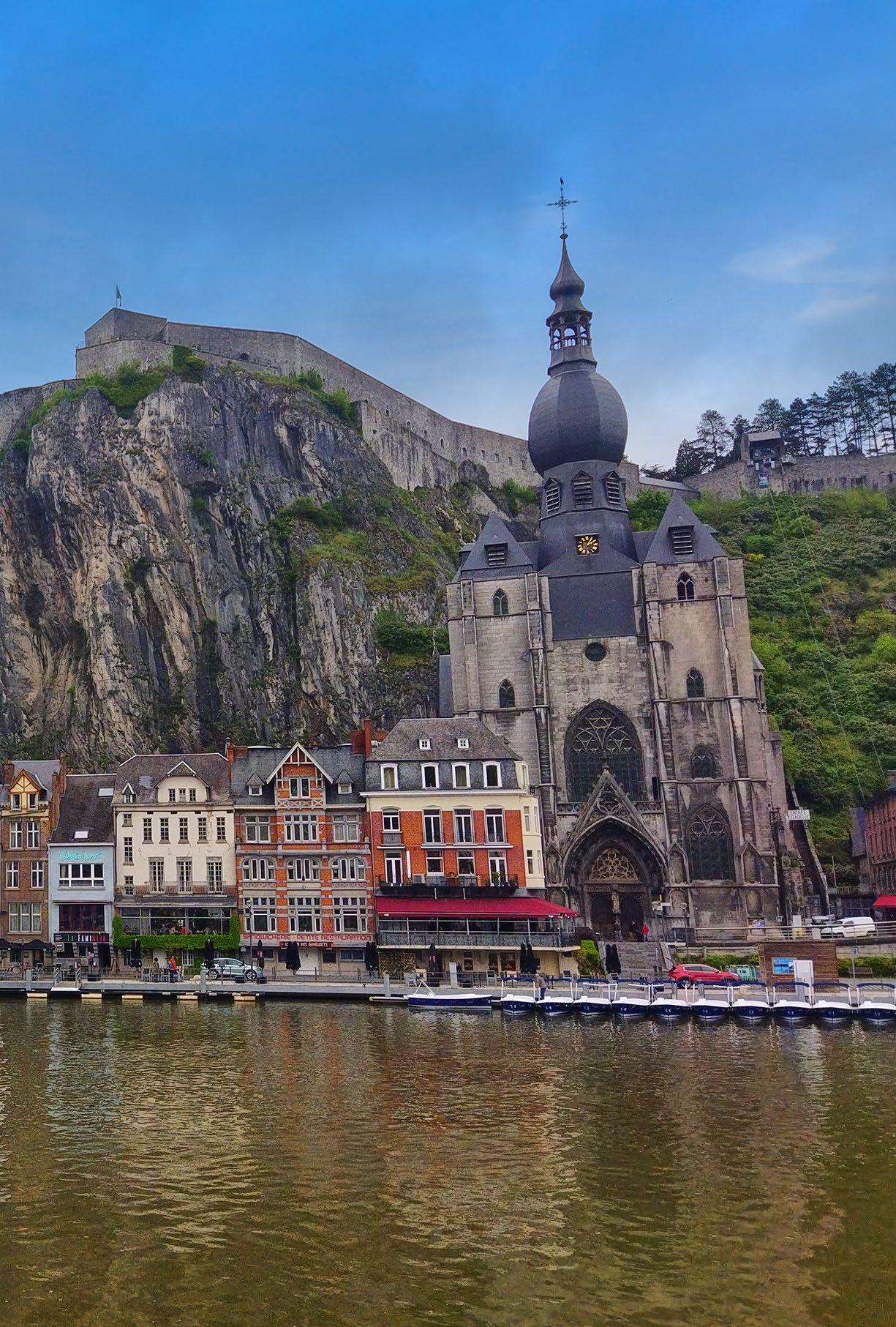 as margens do rio, encontra-se a igreja Notre-Dame de Dinant, uma obra-prima arquitetônica, que deixa qualquer um boquiaberto. a catedral gótica impressiona por sua fachada notável com uma torre imponente e o interior é ainda mais majestoso