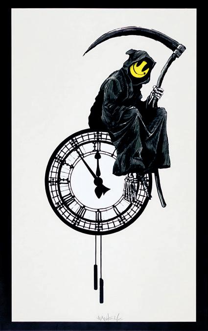 Grin Reaper representa la imagen tradicional de la Muerte, pero con un emoticono sonriente de color amarillo intenso. Lleva en la mano su guadaña y está sentada sobre la esfera de un reloj que se asemeja a la del Big Ben de Londres. Faltan cinco minutos para la medianoche, como si la Muerte estuviera esperando que llegara la hora para comenzar a trabajar.