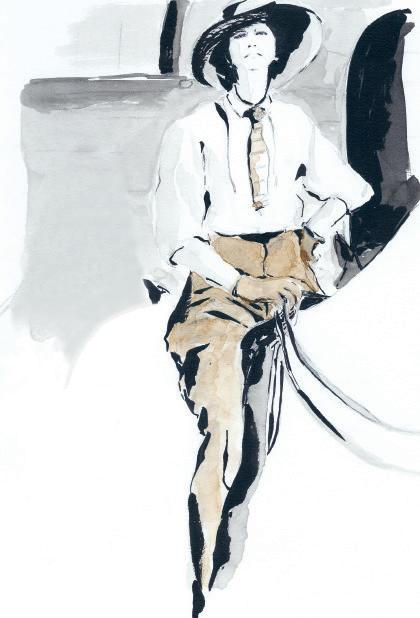 Aunque tenía que comer con el servicio, Chanel tenía acceso a los caballos de Balsan. Fue entonces cuando se convirtió en una intrépida jinete. Como se negaba a cabalgar de lado, tenía que usar pantalones de montar. Detestaba las prendas frívolas y encorsetadas que estaban de moda en la época, y se decantaba por un estilo más deportivo y masculino, que la hacía destacar. Su inspiración no provino de las aristócratas con quienes se codeaba, sino de los jinetes y los mozos de cuadra, y ya por entonces era una entusiasta de la ropa práctica que permitía moverse libremente sin renunciar a la elegancia.