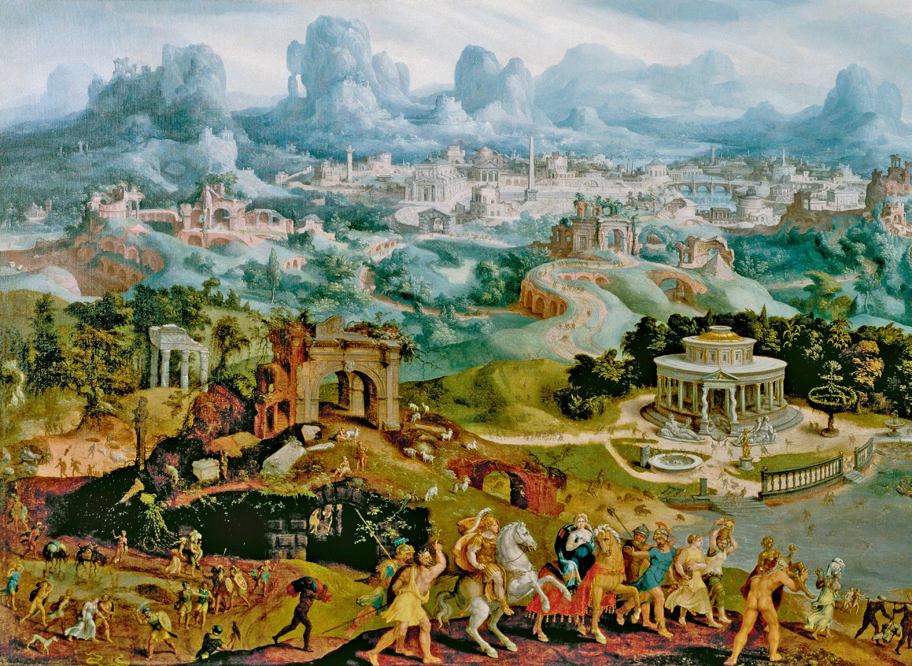 Panorama con el rapto de Helena entre las maravillas del mundo antiguo, Maerten van Heemskerck, 1535. Esta obra de arte es una especie de rompecabezas que reta al espectador a identificar lugares y referencias clásicas. Por ejemplo, el arco iris del fondo identifica a la diosa Iris, que dio la noticia del rapto al marido de Helena.