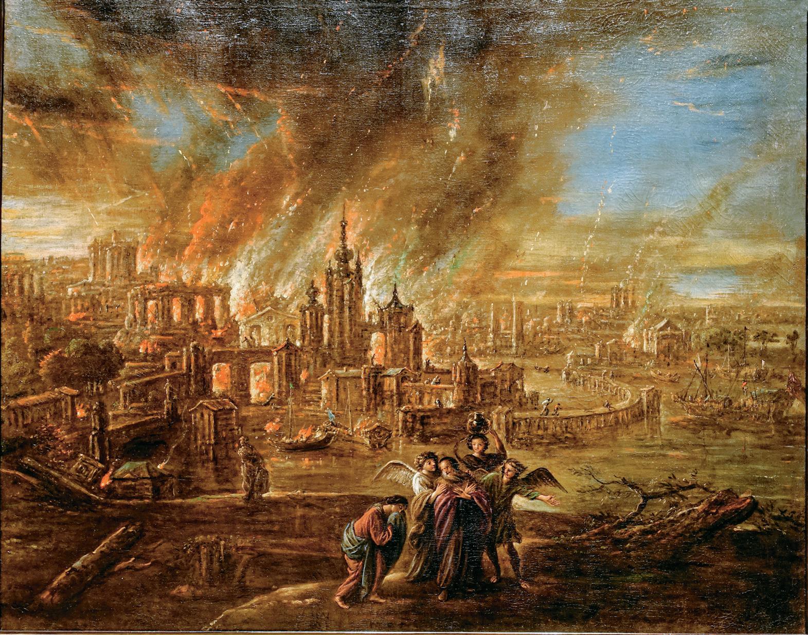 Ayudados por ángeles, Lot y su familia huyen de Sodoma, la ciudad condenada, en este óleo de Jacob Jacobsz de Wet, en torno al 1680.