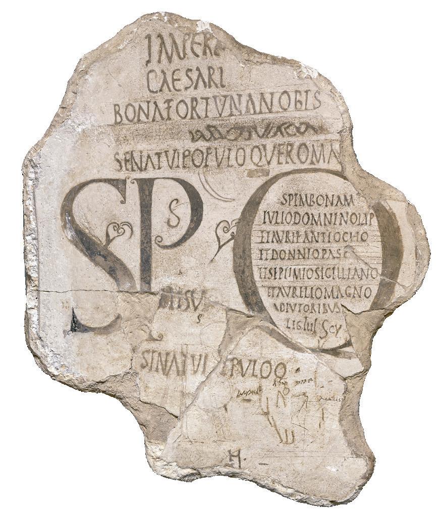 Izquierda Inscripción hallada en Dura Europos que invoca buena fortuna para el emperador, el senado y el pueblo de Roma.