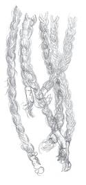 1 Primero, esbozo el contorno de cada trenza. Ahúso un poco sus extremos y añado una línea por la parte inferior de cada una para indicar los lazos con las que están sujetas.