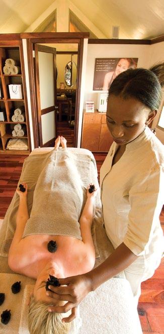 Una variedad de faciales y masajes corporales se llevan a cabo en la suite de tratamiento con que cuenta el oasis, aun cuando también pueden solicitarse en la habitación o al aire libre. Los productos 100% orgánicos incluyen esencias, ungüentos y aceites de marcas prestigiosas, como Thalgo y Africology.