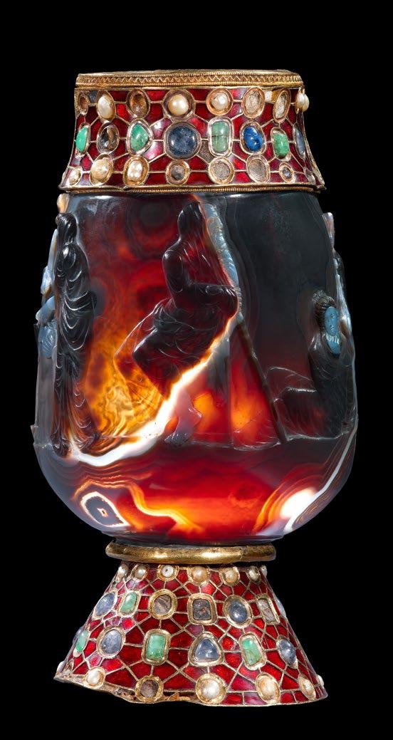 En estas páginas. Jarrón de San Martín. Sardónice de origen romano (c. 100 a.C.) realzado con orfebrería carolíngia, granate, perlas, esmeraldas, zafiros, iolitas (c. 500 d.C.). Fotos: JeanYves Glassey y Michel Martinez © Trésor de l’abbaye de Saint Maurice.