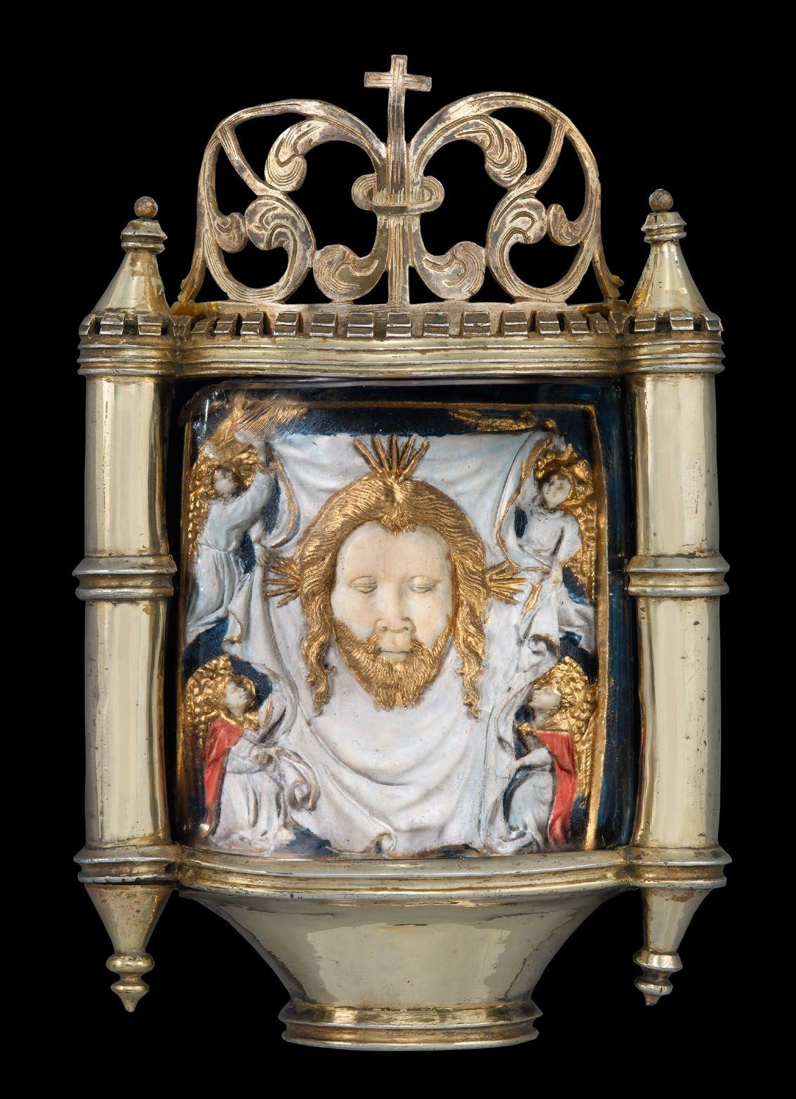 Página opuesta. Osculatorio o portapaz. Plata dorada, cobre (cornisa), cristal de roca y marfil de elefante policromado (c. 1400).