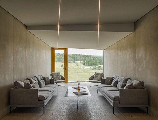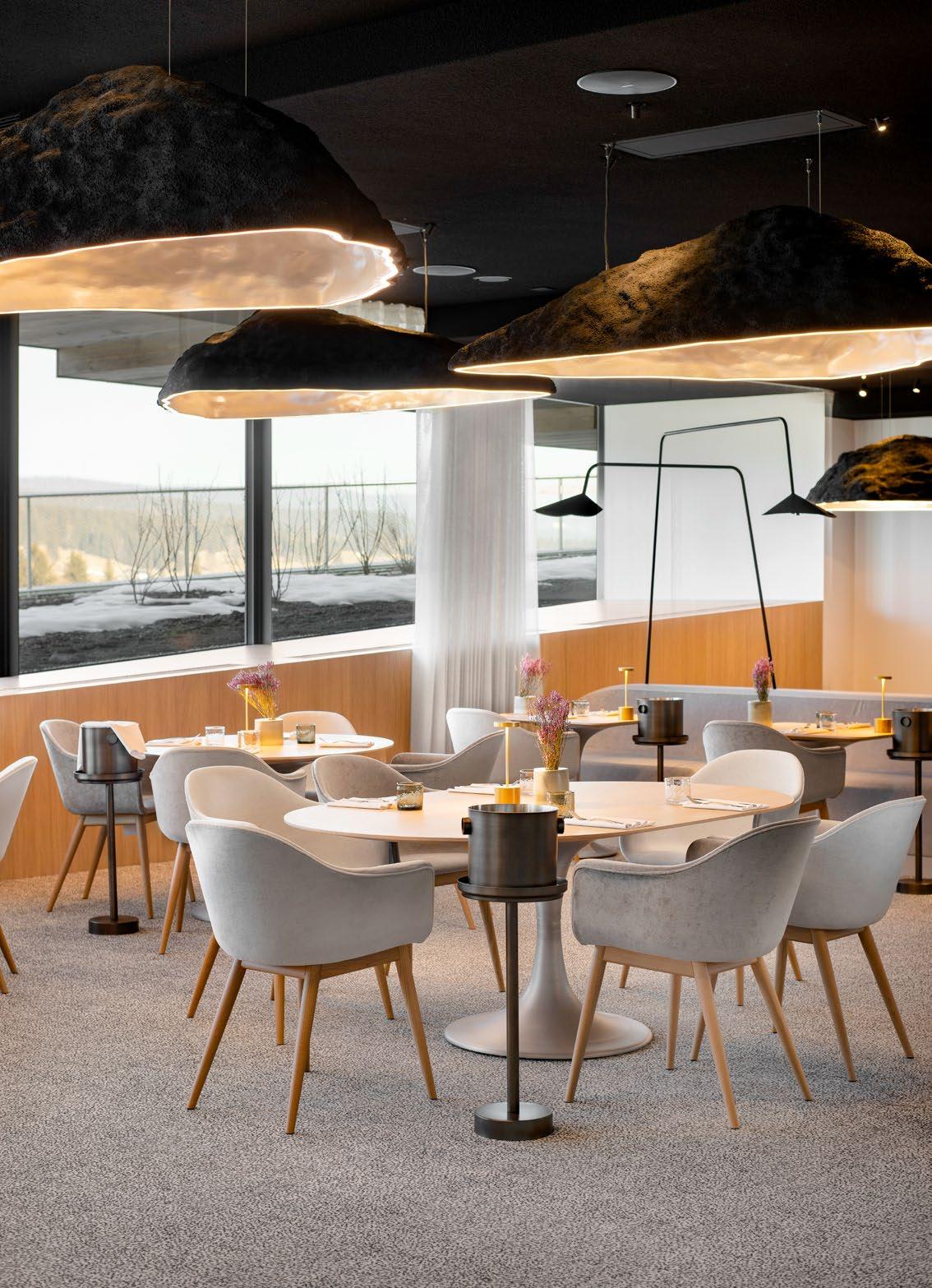El hotel se integra a la perfección en el paisaje circundante y su diseño transparente de vanguardia permite aprovechar la luz del día, para que se utilice menos la luz artificial. BIG lo concibió de modo que desde todas las 50 habitaciones y suites se contemplaran inspiradoras vistas de la región. La propiedad contiene asimismo un Bar abierto al público en general, un centro de bienestar y salones para seminarios y eventos. El Spa cuenta con productos 100% suizos, elaborados por la marca Alpeor, con plantas y flores nativas de la región. Concebido como punto de encuentro para habitantes locales, viajeros en busca de zonas verdes preservadas y entusiastas de la relojería y la arquitectura, la propiedad invita también a dedicarse tiempo para establecer conexiones con la naturaleza. El interiorismo del hotel rinde homenaje a los paisajes de La Vallée de Joux con una construcción que cede el protagonismo a los materiales locales, como la piedra y la madera. Un itinerario interior, a lo largo de la estructura serpenteante del edificio, conecta las 50 habitaciones y suites con las diversas instalaciones. La decoración acogedora y refinada, entrelaza superficies de abetos locales, grandes ventanales y hormigón liso con un efecto contemporáneo. El techo del vestíbulo exhibe imponentes árboles blancos, que dan la impresión del bosque local de Risoud, reflejado en el lago de Joux. El diseño interior adentra al huésped en el entorno natural, con una fusión de calidad y confort. La propiedad otorga un lugar de honor a la gastronomía, al confiar sus establecimientos de restauración al chef francés Emmanuel Renaut, galardonado con tres estrellas Michelin. El Bar des Horlogers ofrece unos platillos regionales y cocteles de autor, con base en plantas del bosque de Risoud, que se pueden degustar en un ambiente relajante, donde se logran apreciar las tonalidades de los licores, gracias a las luces colocadas detrás de las botellas. Le Gogant, con capacidad para 80 comensales, presenta un menú extenso y refinado, disponible para el almuerzo y la cena durante los 365 días del año. En el dialecto local el término gogant hace referencia a una variedad de abeto, a menudo aislado, cuya amplia base sirve de refugio. Detrás de Le Gogant, un espacio íntimo acoge La Table des Horlogers, que puede reunir hasta 12 comensales. A diario sirve un menú degustación, que despierta los sentidos.