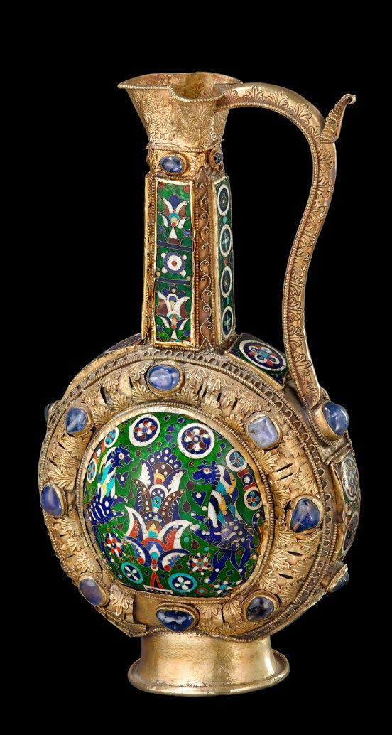 Arriba. Jarro de Carlomagno. Oro, filigranas, zafiros, calcedonia y esmaltes bizantinos que representan un Árbol de la Vida (s. IX).