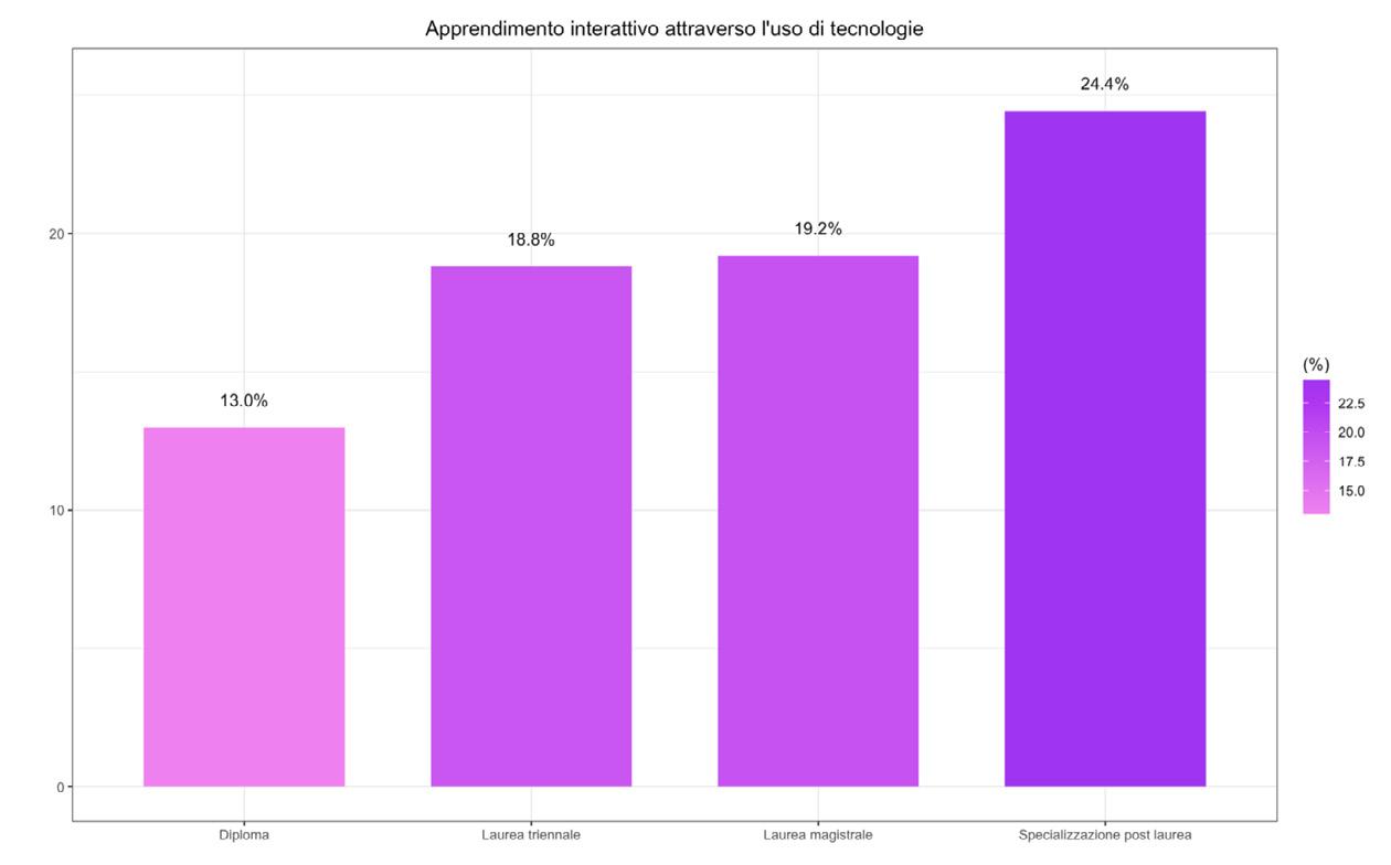 Figura 5 Per ogni gruppo di livello di istruzione, percentuali relative alla didattica Apprendimento interattivo attraverso l’uso di tecnologie.