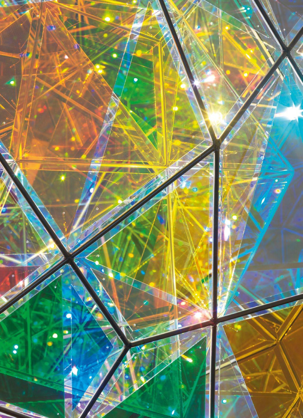 pièces saturées et englobantes. En poursuivant le parcours, un polyèdre multicolore multiforme et psychédélique suspendu au plafond et un kaléidoscope en six teintes différentes permettent de percevoir des formes infinies qui irradient l'espace.