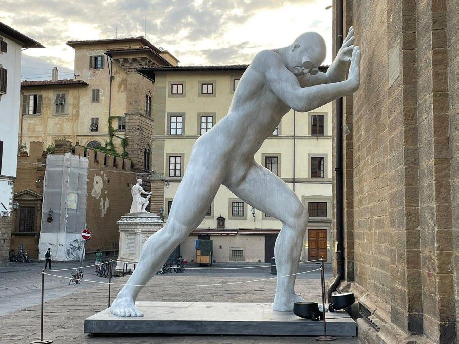 Un colosso latteo di quasi sei metri sembra sorreggere la Basilica di San Lorenzo dal suo lato sinistro, con sforzo pla stico, muscoli tesi, viso contratto. Si chiama Mr. Arbitrium, la scultura monumentale di Emanuele Giannelli, realizzata con una complessa tecnica in resina, stuccata e dipinta a mano con effetto marmoreo e in residenza a Firenze fino al 31 otto bre. Proprio là dove pare che Michelangelo avesse previsto una colonna nella sua facciata mai realizzata.