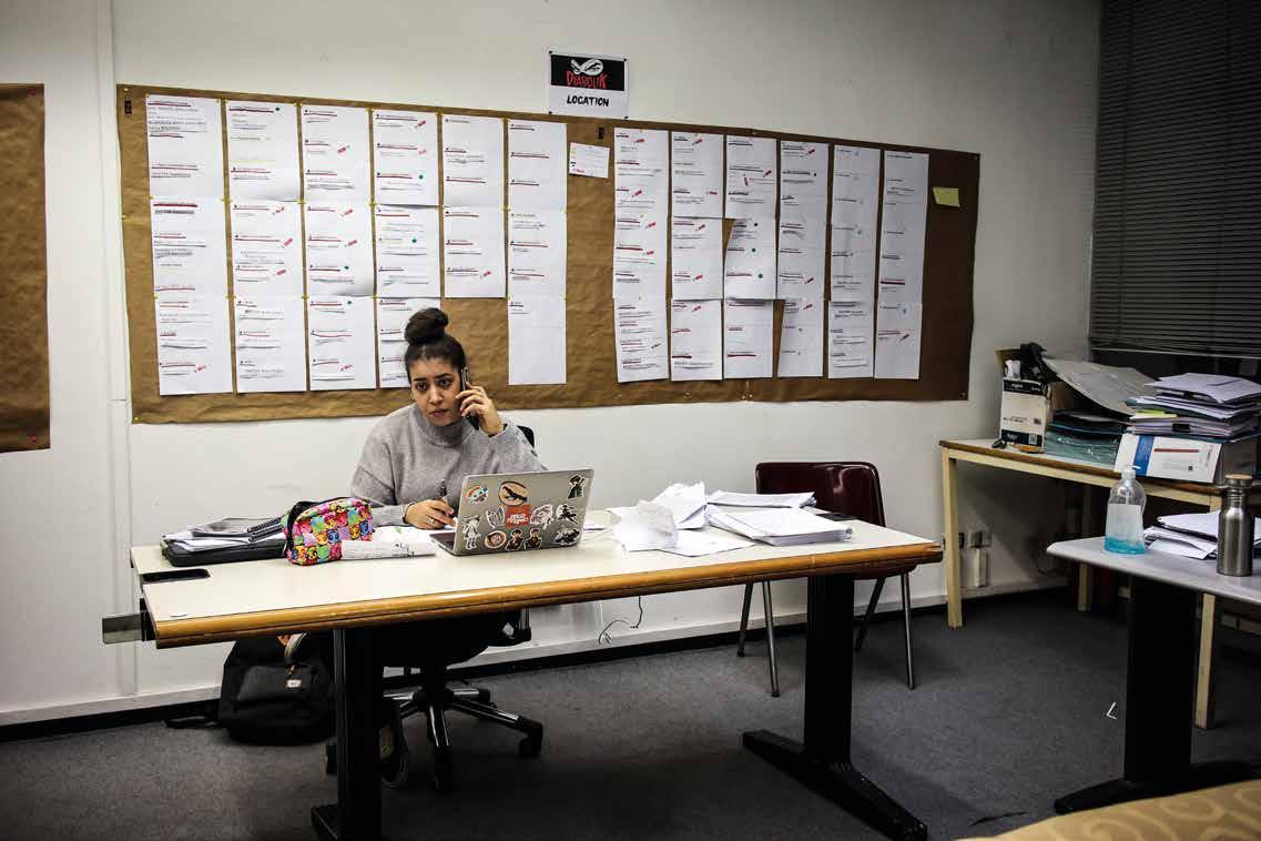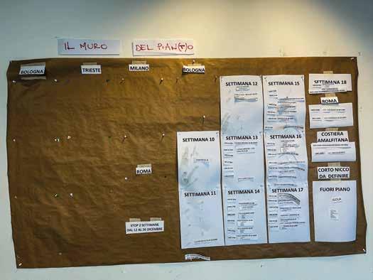 L'espressione sul volto dell'assistente alla regia Sanaà Selfaoui rende l'idea di quanti problemi, ogni giorno, si devono affrontare in un progetto così grande come girare due f ilm di Diabolik contemporaneamente. Sotto: Il muro del pian(t)o di lavorazione.