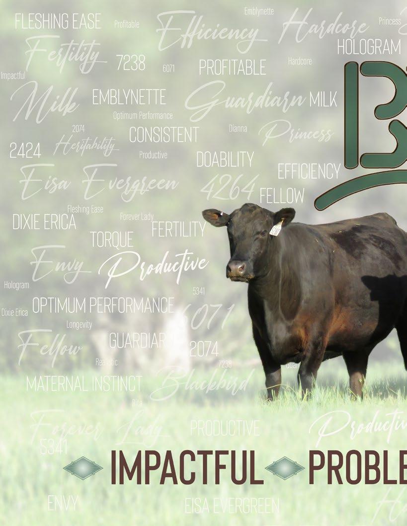 SCHOOL B62 HOOK’S XTRAVAGANZA 7X 2521E 3295763 3C WALLY C240 BLK 6158Z 6158 3/4 AN 1/4 CS • Act BW 80 Sept. 1 Weight 1450 CE BW WW YW MCE Milk stay marb. rea api ti 14.7 -0.9 81 132 7.8 15 15 0.33 0.35 133 79 161 CIRCLE ENVY K717 BD: 4/11/2022 Reg #:4152333 Tattoo: K717 RITO 707 OF IDEAL 3407 7075 S A V RECHARGE 3436 S A V BLACKCAP MAY 4136 BRUIN ENVY 7248 3728783 O C C GREAT PLAINS 943G BRUIN 943G BLACKBIRD 4264 FALCON BLACKBIRD 6071 LEACHMAN RIGHT TIME CIRCLE OLD SCHOOL B62 HOOK’S XTRAVAGANZA 7X 1732E 3295674 NLC PAYDAY 16P 6203Y 6203 1/4 SM 3/4 AN • Homozygous Black Act BW 91 Sept. 1 Weight 1435 CE BW WW YW MCE Milk stay marb. rea api ti 12.4 0.1 85 138 6.2 16 16 0.28 0.5 129 79 162 CIRCLE ENVY K731 BD: 4/9/2022 Reg #:4152449 Tattoo: K731 RITO 707 OF IDEAL 3407 7075 S A V RECHARGE 3436 S A V BLACKCAP MAY 4136 BRUIN ENVY 7248 3728783 O C C GREAT PLAINS 943G BRUIN 943G BLACKBIRD 4264 FALCON BLACKBIRD 6071 LEACHMAN RIGHT TIME CIRCLE OLD SCHOOL B62 HOOK’S XTRAVAGANZA 7X 7434 3504039 NLC PAYDAY 16P NLC W70 NLC EDWINA M72-R61 1/4 SM 3/4 AN • Homozygous Black Act BW 86 Sept. 1 Weight 1342 CE BW WW YW MCE Milk stay marb. rea api ti 10.5 -0.2 80 131 5.3 15 11 0.18 0.25 110 74 163 CIRCLE ENVY K715 BD: 4/16/2022 Reg #:4152359 Tattoo: K715 RITO 707 OF IDEAL 3407 7075 S A V RECHARGE 3436 S A V BLACKCAP MAY 4136 BRUIN ENVY 7248 3728783 O C C GREAT PLAINS 943G BRUIN 943G BLACKBIRD 4264 FALCON BLACKBIRD 6071 LEACHMAN RIGHT TIME CIRCLE OLD SCHOOL B62 HOOK’S XTRAVAGANZA 7X 1743E 3295680 NLC PAYDAY 16P 6176Y 6176 1/4 SM 3/4 AN • Homozygous Black Act BW 74 Sept. 1 Weight 1402 CE BW WW YW MCE Milk stay marb. rea api ti 15.7 -1.2 71 112 8.5 16 13 0.14 0.73 117 69 164