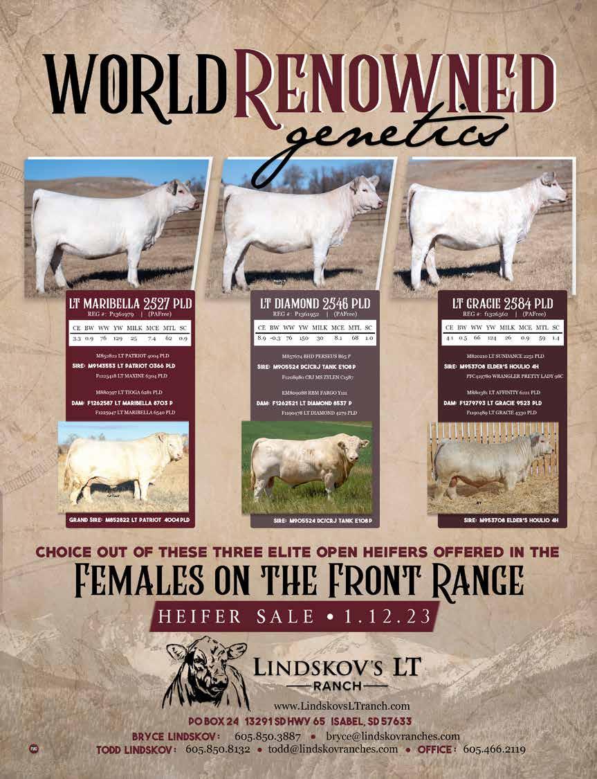 YOU YOUR SUPPORT LOT 102 MCR MS LEDGER 1757 P Rennert Ranch, Elm Creek, NE & White Rose Charolais, Clearwater, MN FH MS BELL 1082 P Double R Dees, Nacogdoches, TX LOT 101A LOT 102A FH GUN RUNNER 2024 P Rennert Ranch, Elm Creek, NE PICK OF THE HEIFERS LOT 103A FH MS 467 SILVER ELVIRA 2014 P White Rose Charolais, Clearwater, MN We invite you to join us Saturday, November 4, 2023 at the ranch for Volume 4. D E C E M B E R 2 0 2 2 13