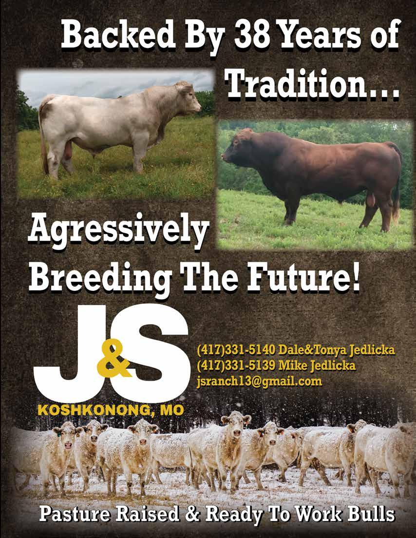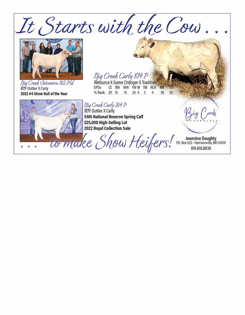 22 Generations Cowherd built with daughters and granddaughters of –Ledger • Grid Maker • Easy Pro Flash • Gold Standard • Bluegrass Royce • Sovereign • Fargo Resource • Mac 809 WCR Legacy Watch for our consignments to Autumn in the Ozarks, The Renaissance Sale and NextGen Flint Hills Spring Classic. Dan & Connie Corman • Pomona, MO (417) 252-1373 www.CormanCharolais.com CHAROLAIS Breeding Charolais Since 1958 Fall 2022 – Born Heifer Calves. Sires include –VPI The Graduate 917G LT Badge 9184 Pld FH Mr New Standard 0036 Pld AI Sires –Calves Fall 2023 OW Lead Time 6294 Pld JMAR Jefferson 8M11 VPI The Graduate 917G Bred Produce On Gra