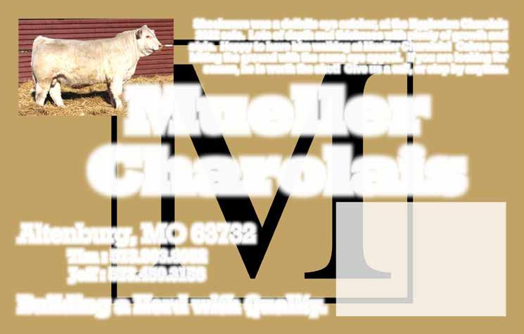 For more information and pictures check out our website! www.angellthomascharolais.com Charolais & Charolais Composite Bulls • Charolais Composite Bred Heifers Charolais Red Angus Composite Open Yearling Heifers • Selling on October 21, 2023 • 17445 Monroe CR 817 • Paris, MO 65275 Sally: 573-682-7348 • sangell@centurylink.net Russ & Sally Thomas View Livestock 10:00 a.m. • Lunch 11:30 a.m. • Auction 12:30 p.m. Call for a Sire Directory or View Online www.cattlevisions.com “Our genetic lineup and professional services will bring your cattle visions to reality” 573-641-5270
