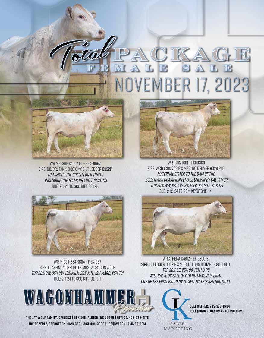 November 17 – Wagonhammer Ranches Total Package Female Sale, at the ranch, Bartlett, Neb. Sale Manager: CK Sales & Marketing.