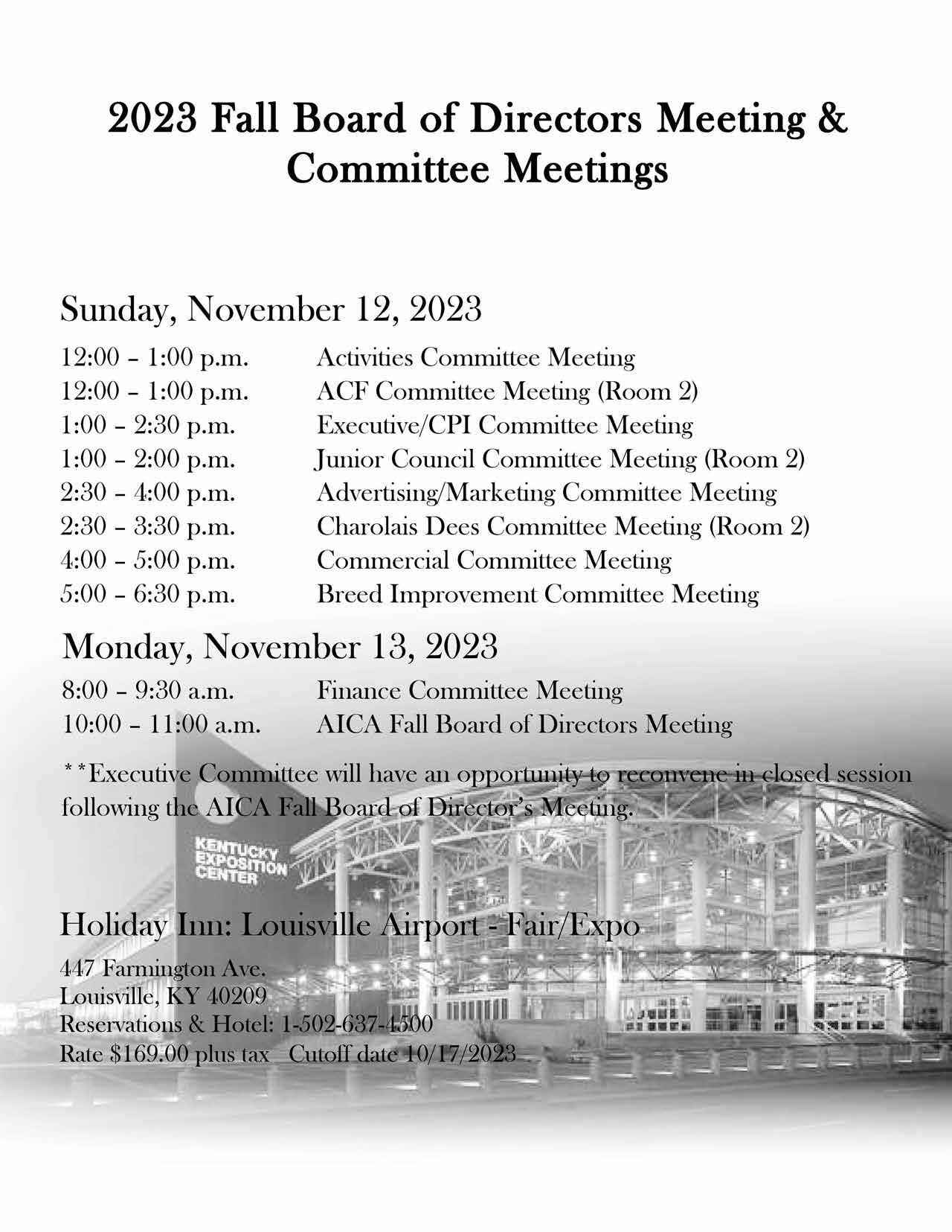 November 12 – 13 – 2023 AICA Fall Board of Directors Meeting & Committee Meetings, Kentucky Exposition Center, Louisville, Ky. Contact: Samantha Corn, AICA.