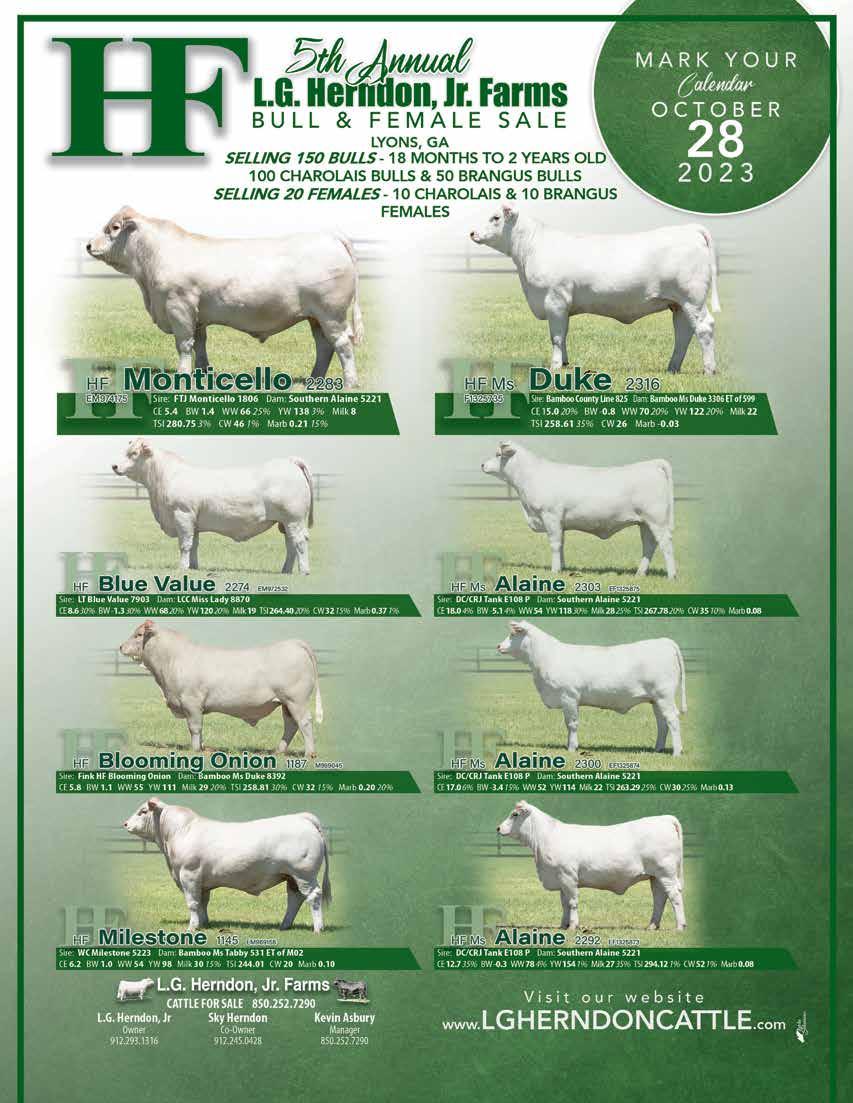 October 28 – L.G. Herndon Jr. Farms Best of the South 5th Annual Black & White Bull & Female Sale, at the farm, Lyons, Ga. Contact: L.G. Herndon Jr., Sky Herndon, or Kevin Asbury.