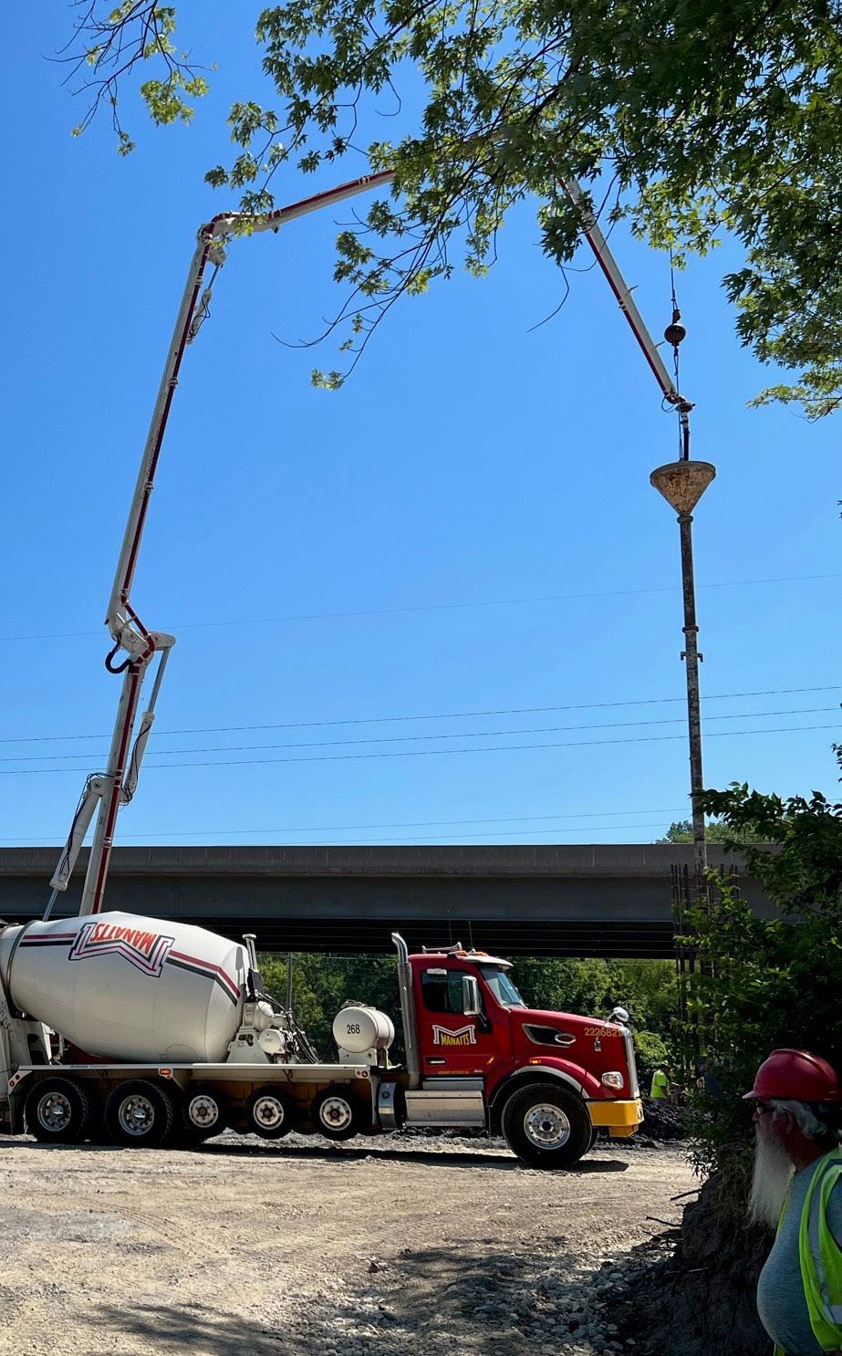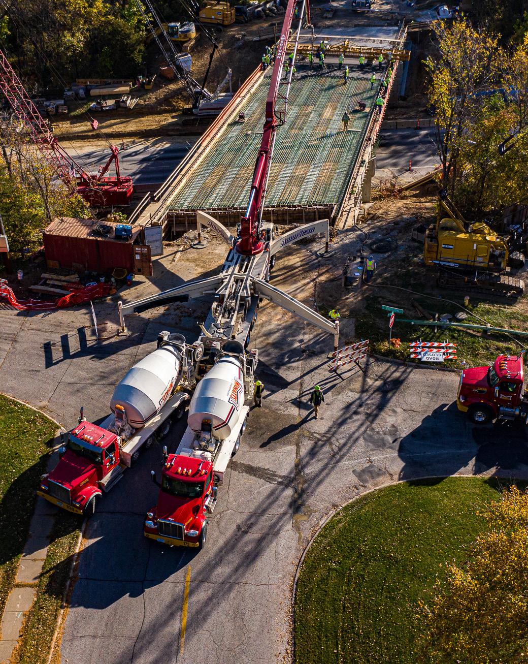 1163 yardas cúbicas de hormigón vertidas en puentes. Esto equivale a 116 camiones mezcladores de 10 yardas cúbicas.