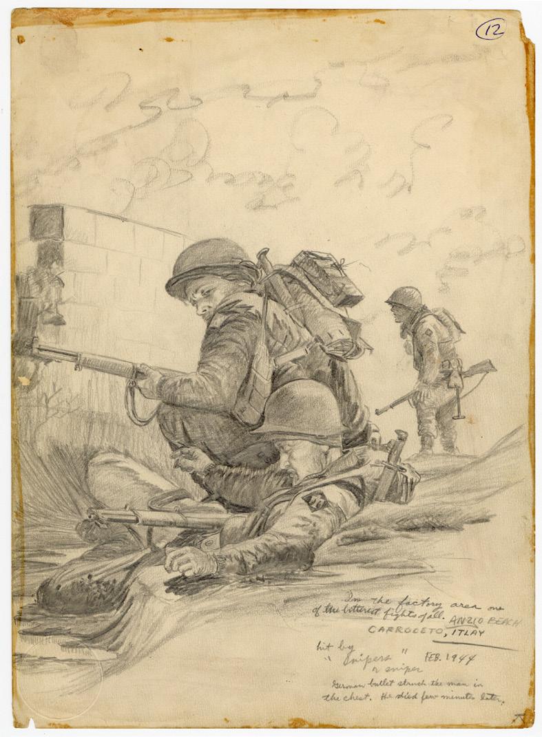 During World War II, soldier Brummett Echohawk of the 45th Infantry Division continued this ancestral Pawnee tradition by sketching the battle scenes occurring in front of his own eyes while stationed in Italy. Echohawk and his comrades landed in the Italian Province of Salerno in 1943, liberating numerous towns from their German occupiers.