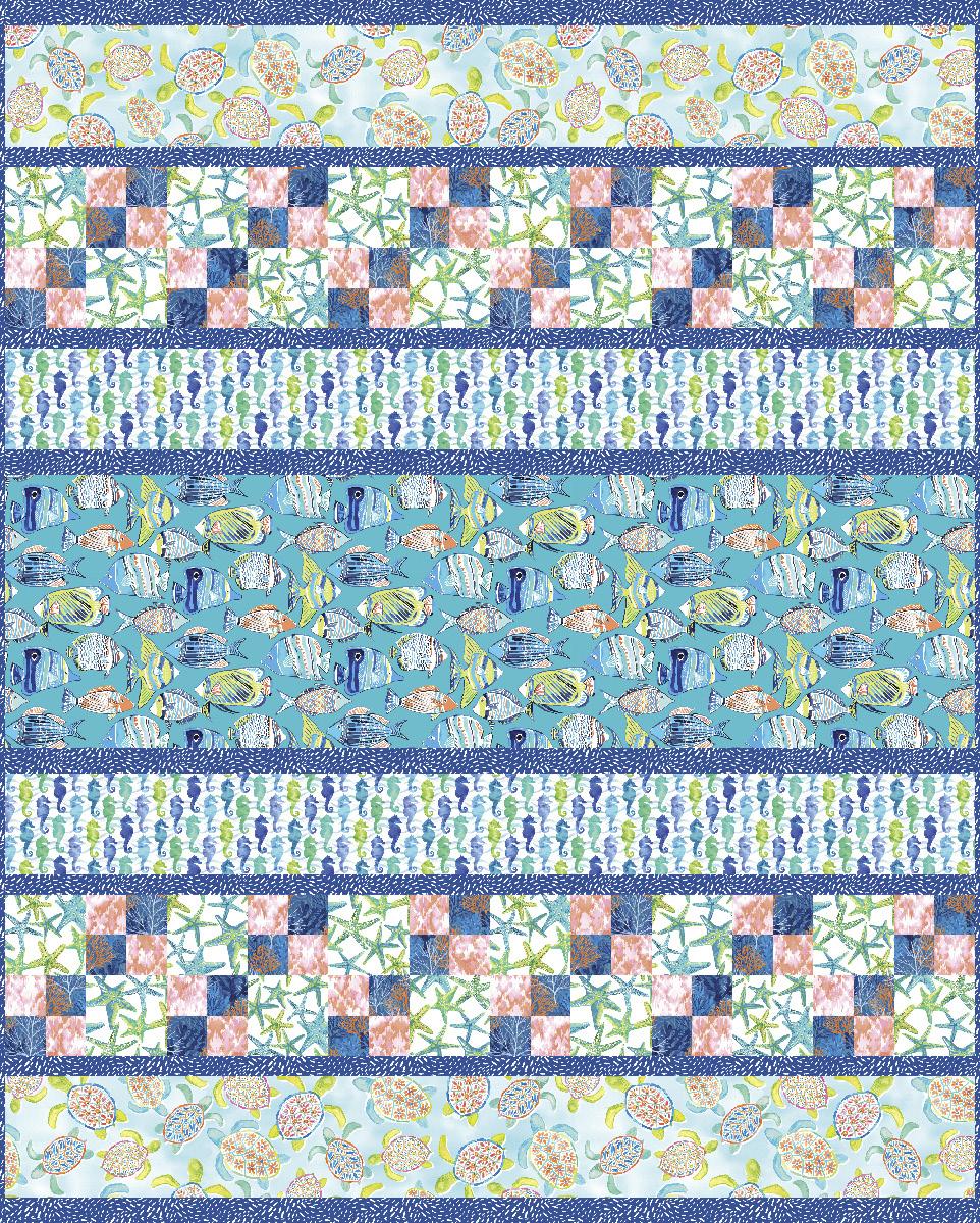 Supplies Needed Finished Quilt Size: 48 in x 60 in (121.92 cm x 152.4 cm) 22934 NVY CTN D (Packed Minnows) 1 yard 1 Bolt 22933 TRQ CTN D (Ocean Life) ⅞ yard 1 Bolt 22935 WHT CTN D (Sea Horsing Around) ⅝ yard 1 Bolt 22927 AQU CTN D (Sea Turtle Cove) 2⁄3 yard 1 Bolt 22931 WHT CTN D (Starfish Toss) ½ yard 1 Bolt 22928 ORG CTN D (Ikat Orange) 1⁄3 yard 1 Bolt 22932 BLU CTN D (Coral Reef) 1⁄3 yard 1 Bolt 22930 TRQ CTN D (Under the Sea) 4 yards 4 Bolts