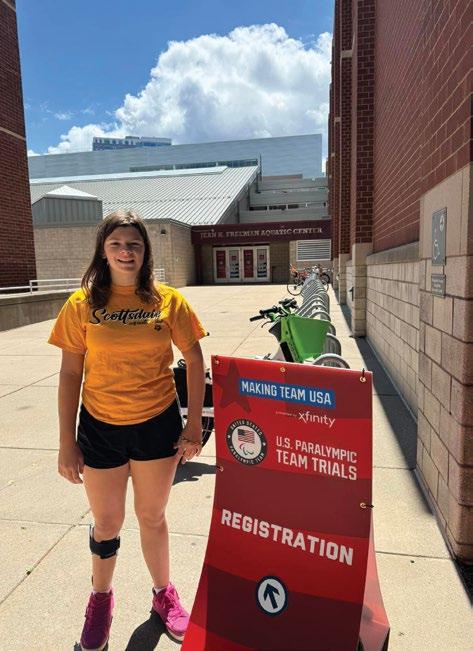 Paralympic Team trials. At the trials, she was intimidated by the older competitors but still competed in all of the 100-meter events and the 200 IM. While she didn’t make it to this year’s Paralympics, Josie set personal bests in every event she swam and is proud of her performance. She now has her sights set on the 2028 Paralympic Games and is focusing on improving her starts, turns, and core strength.