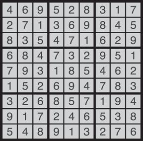Sudoku puzzles are formatted as a 9x9 grid, broken down into nine 3x3 boxes. To solve a sudoku, the numbers 1 through 9 must fill each row, column and box. Each number can appear only once in each row, column and box. You can figure out the order in which the numbers will appear by using the numeric clues already provided in the boxes. SOLUTION ON PAGE