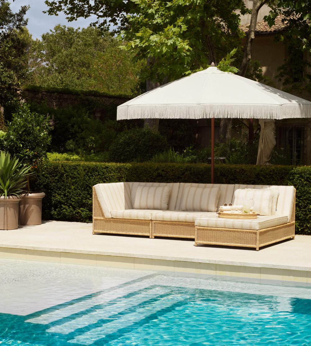 The Hampton modular chair and daybed in faux rattan offer flexible seating that can be rearranged to suit any occasion, while the Nomade sofa, crafted from natural teak, effortlessly transforms from a cozy seat into a spacious lounger. These versatile pieces maximize space and adapt to your lifestyle, blending comfort with functionality.