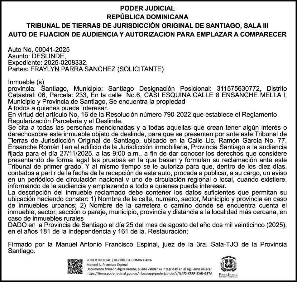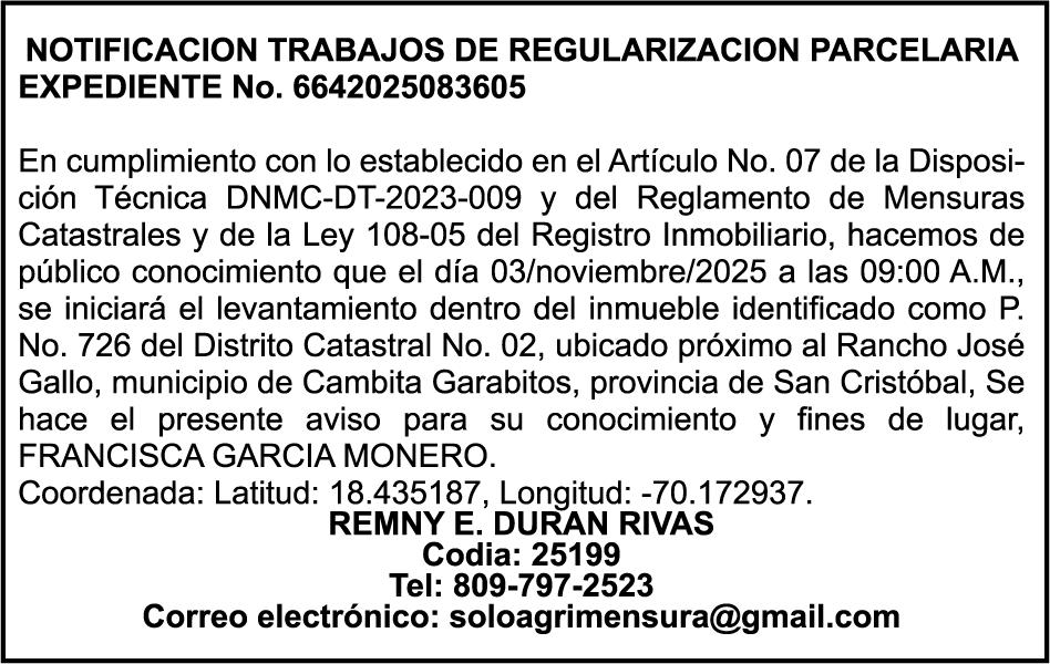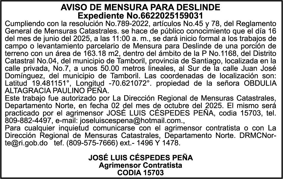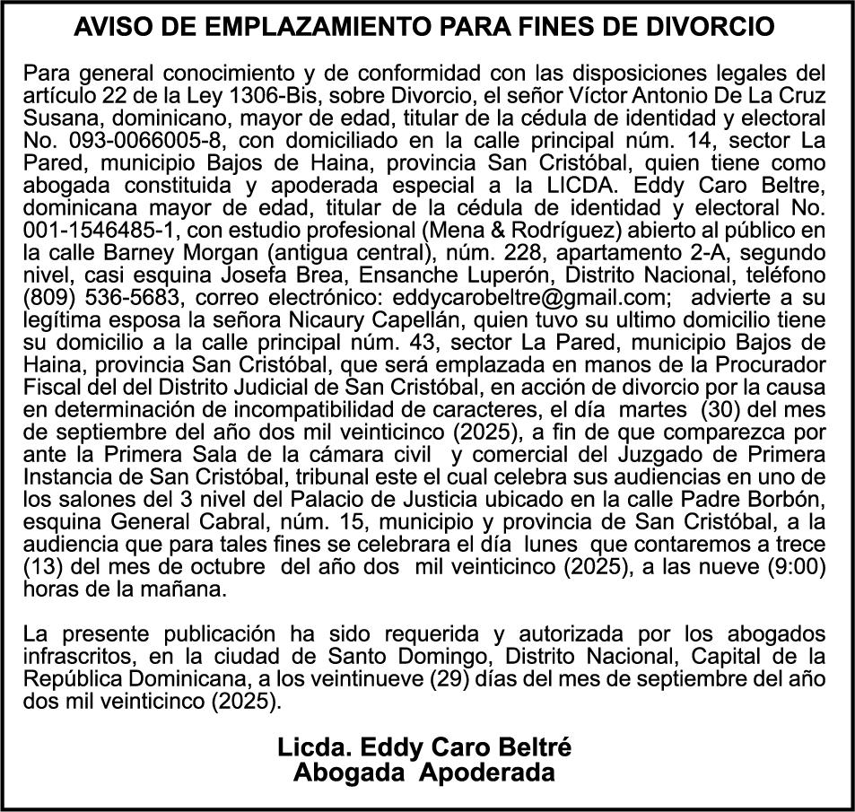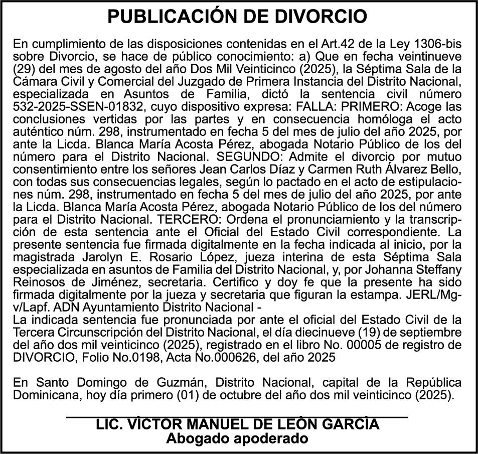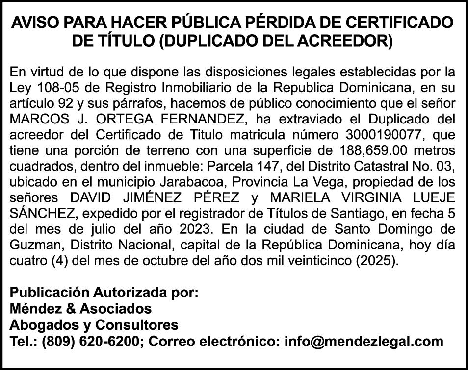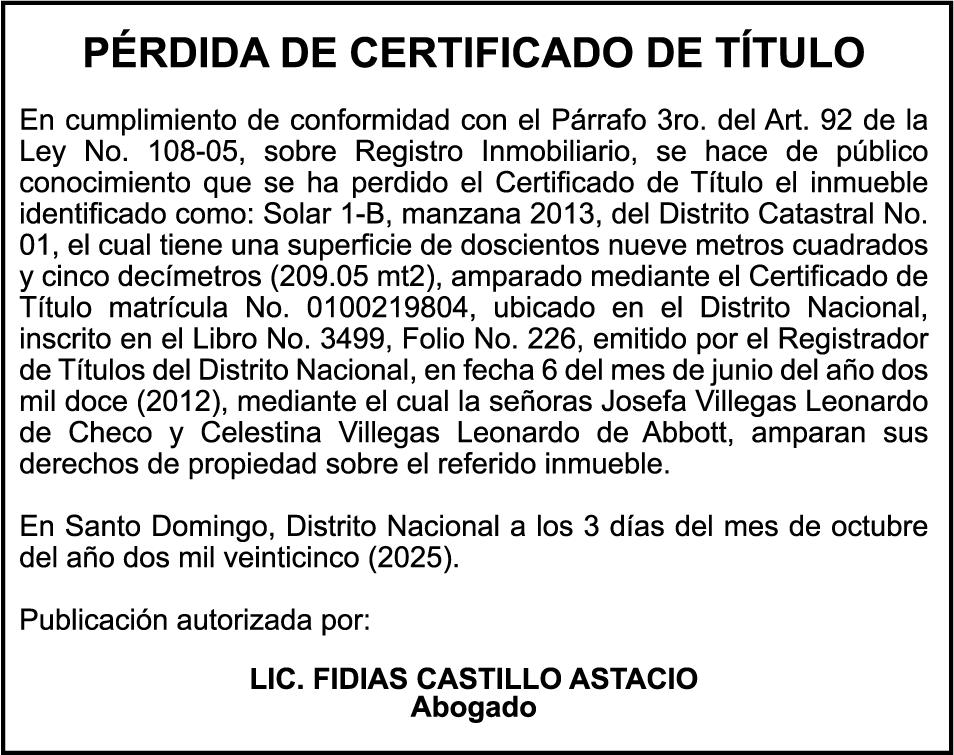 SE hace de público conocimiento la pérdida del Certificado Financiero número 850408592 emitido por Banco Popular Dominicano, S. A. Banco Múltiple, a nombre de CLELIA ANGELICA DA SILVA GARCIA , portadora de la Cédula de Identidad y Electoral número 001-1512224-4, certificado número 850408592 expedido en fecha 9 de julio de 2025 por el monto de (RD$3,358,881.80) más intereses generados a la fecha.