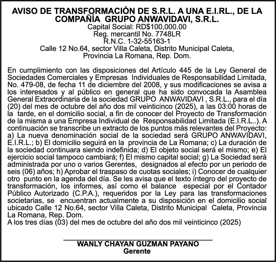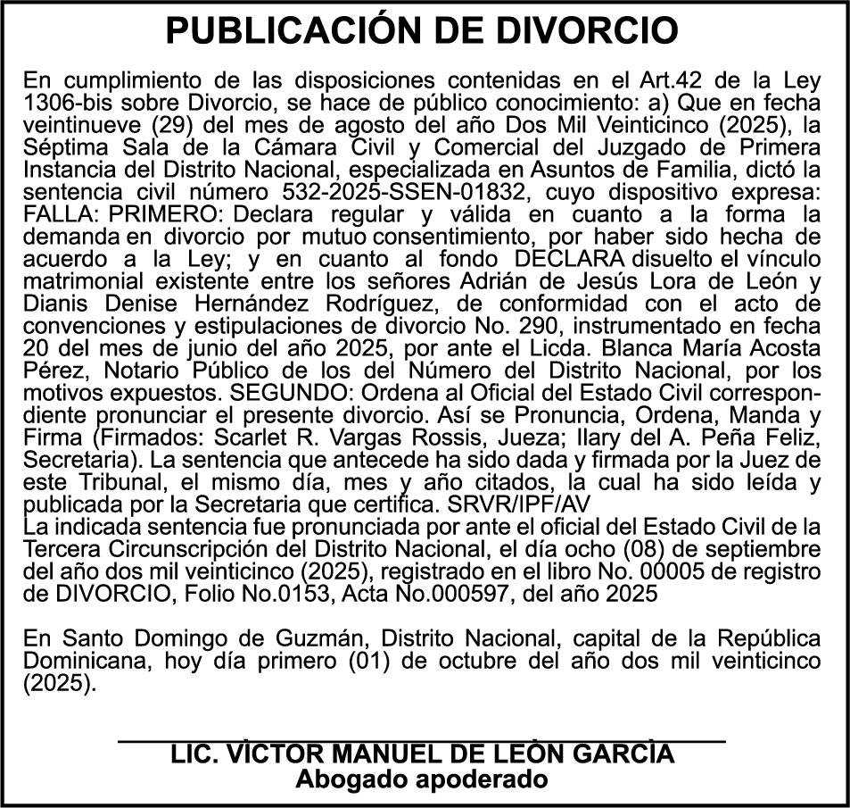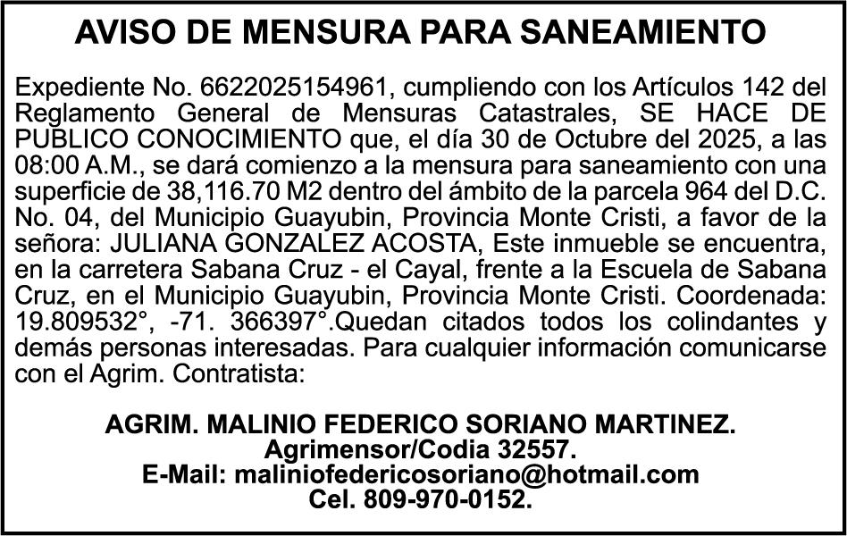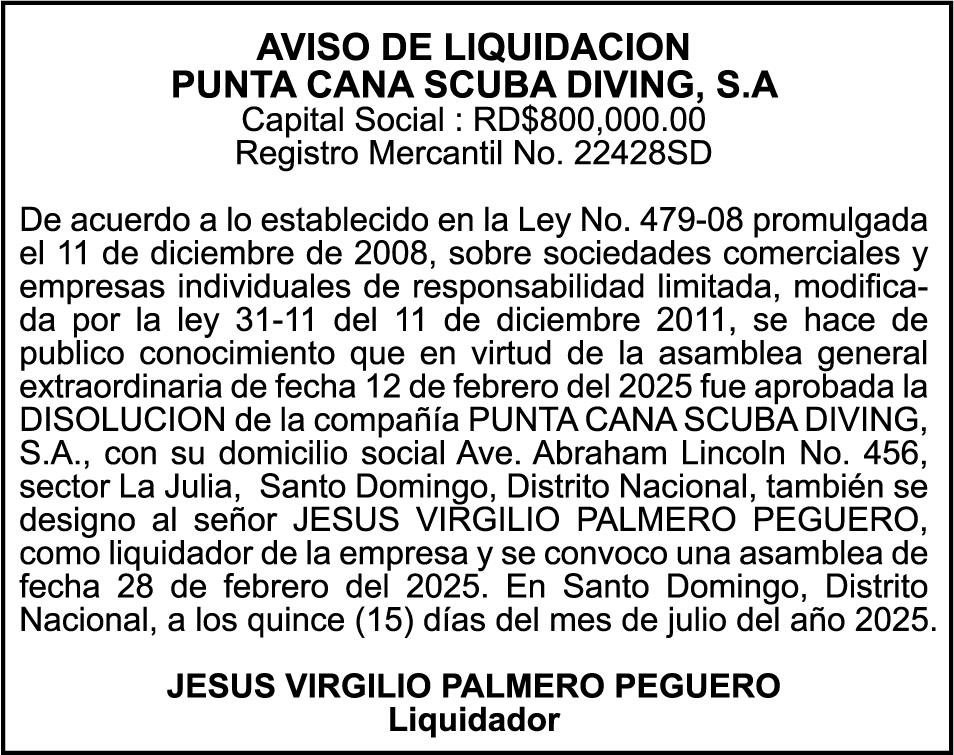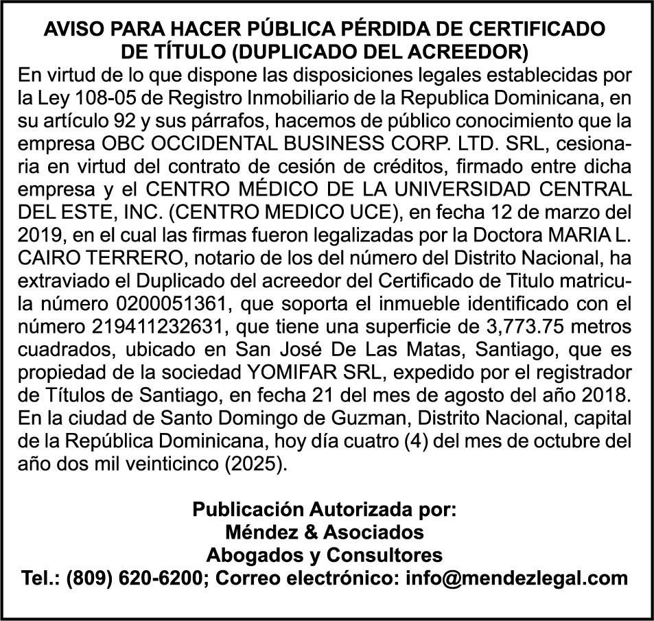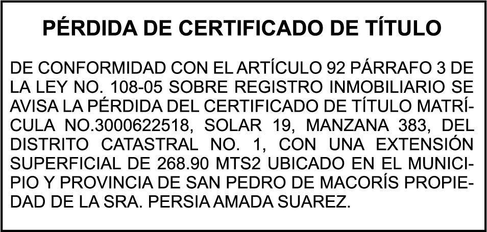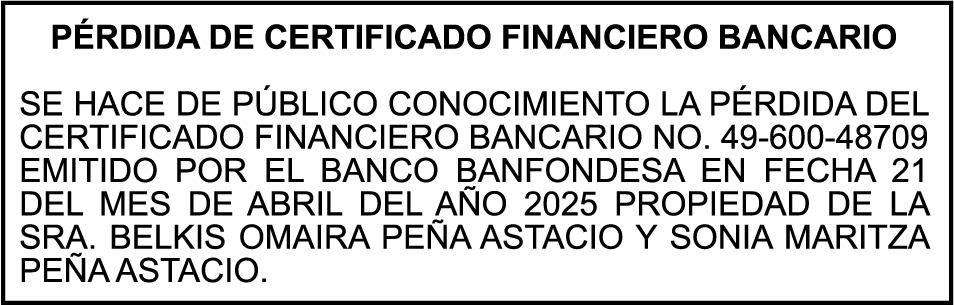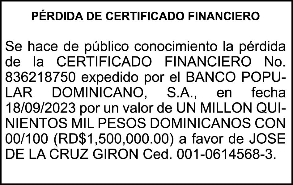 SE hace de público conocimiento la pérdida del Certificado Financiero número 849644885 emitido por Banco Popular Dominicano, S. A. Banco Múltiple, a nombre de MARIANELA S CORAZON ABREU ESTEVEZ, portadora de la Cédula de Identidad y Electoral número 001-0106031-7, certificado número 849644885 expedido en fecha 4 de junio de 2025 por el monto de (RD$141,289.83) más intereses generados a la fecha.