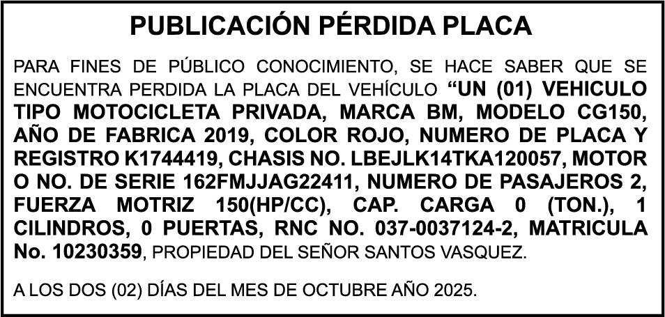 PERDIDA DE PLACA No. K1838598, Motocicleta BAJAJ, modelo PLATINA 100 ES, color rojo, año 2020, chasis MD2A76AY0LWC47332, a nombre de VICTOR MANUEL SANTOS DE LA ROSA, Ced. 005-00500973-2