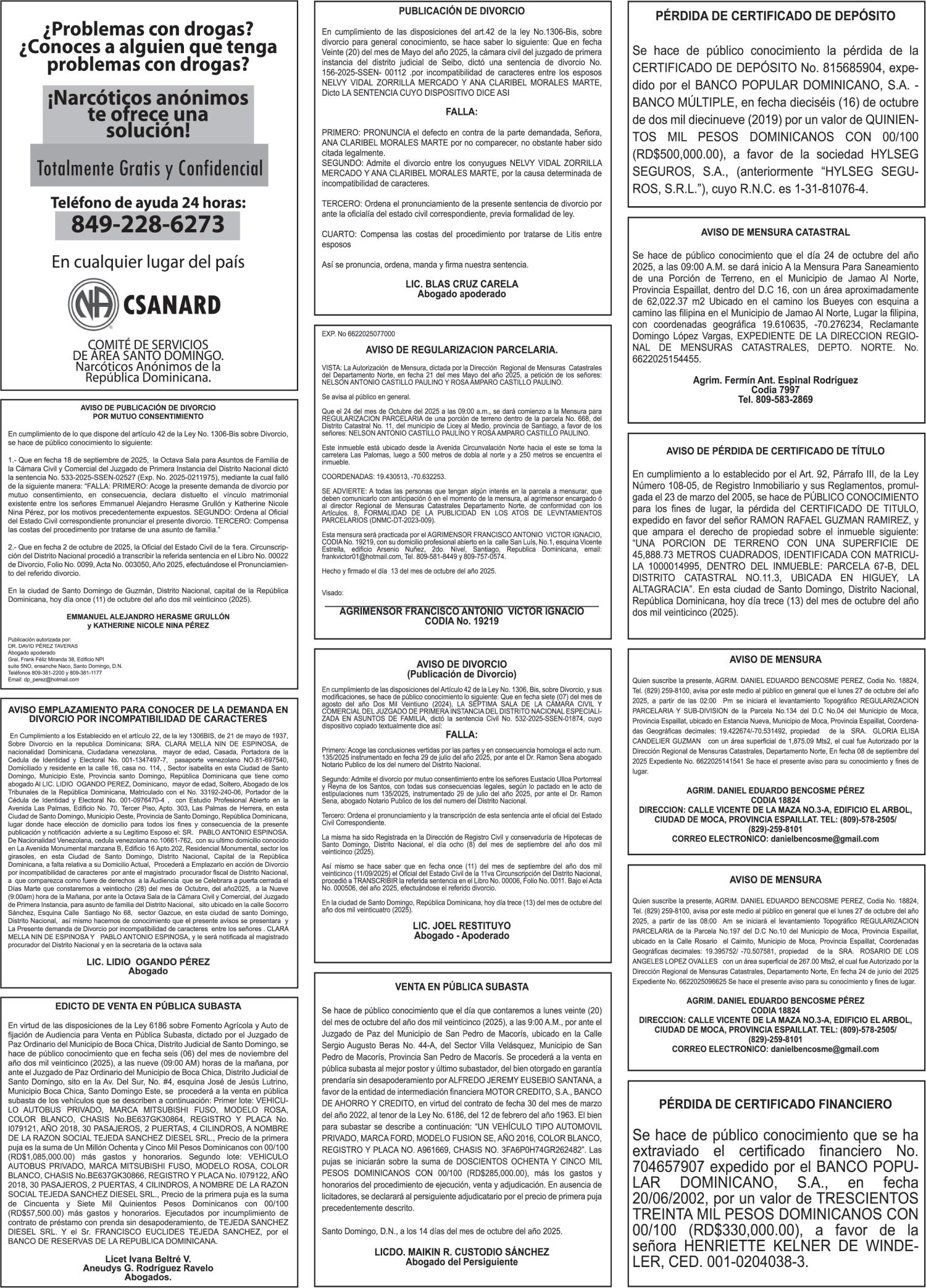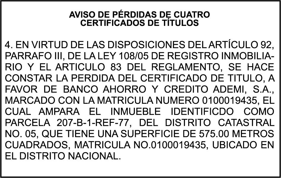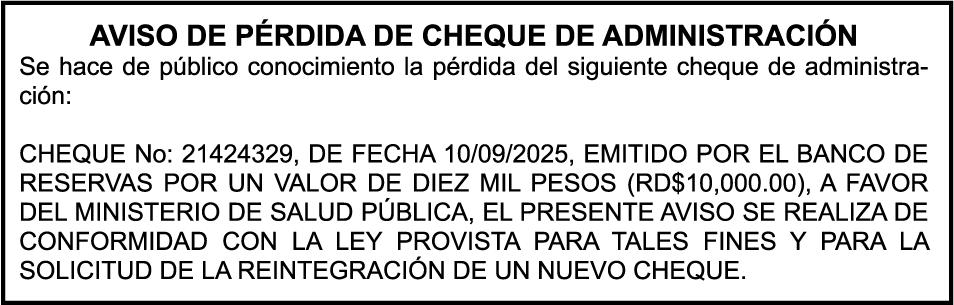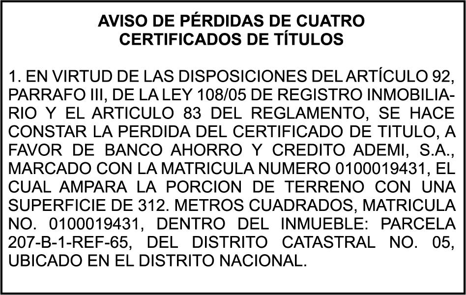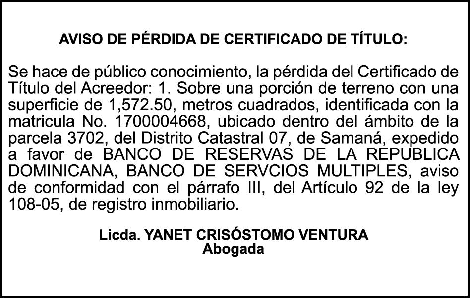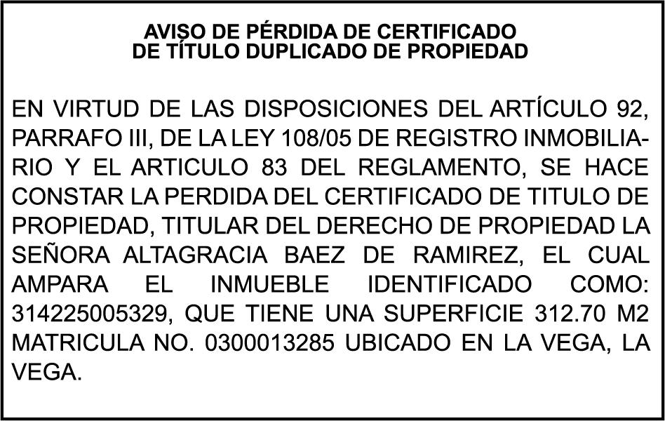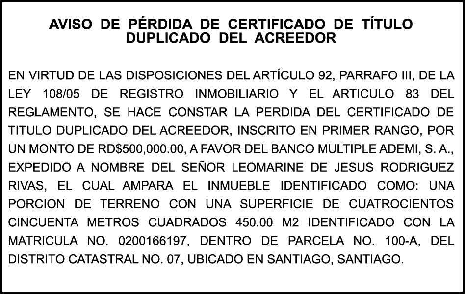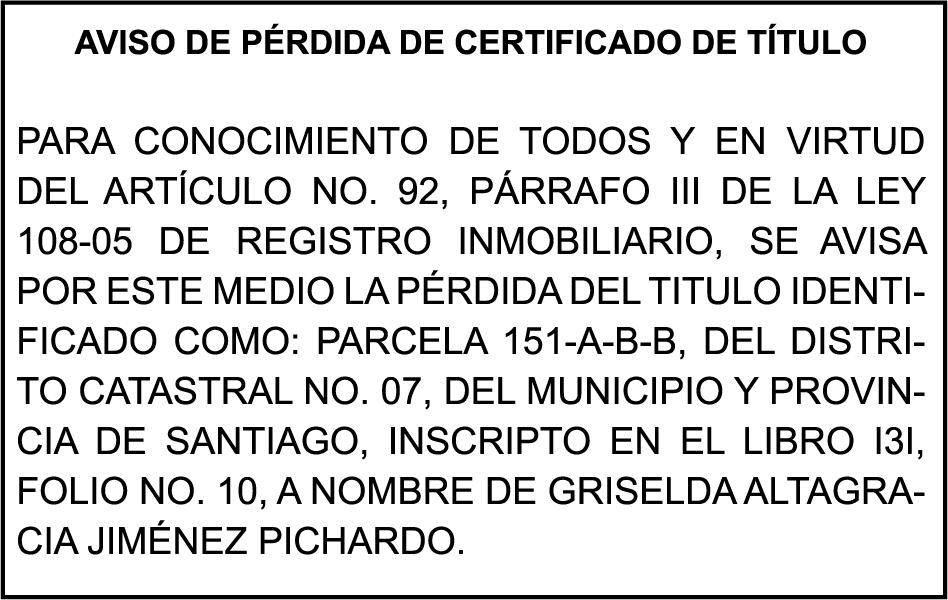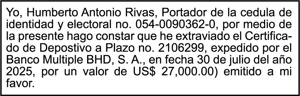 PERDIDA DE MATRICULA Veh. Carga MITSUBISHI, Modelo KO2TUNSLF, Color azul, Año 1989, Placa L165338, Chasis JA7FL24D6KP041332, a nombre de ALEJANDRO VASQUEZ SANTOS. SE hace de público conocimiento la pérdida del Certificado Financiero número 844150433 emitido por Banco Popular Dominicano, S. A. Banco Múltiple, a nombre de EXTALIN ABREU ANGELES, portador de la Cédula de Identidad y Electoral número 001-1316371-1, certificado número 844150433 expedido en 16 de septiembre de 2024 por el monto de (RD$6,192,907.53) más intereses generados a la fecha.