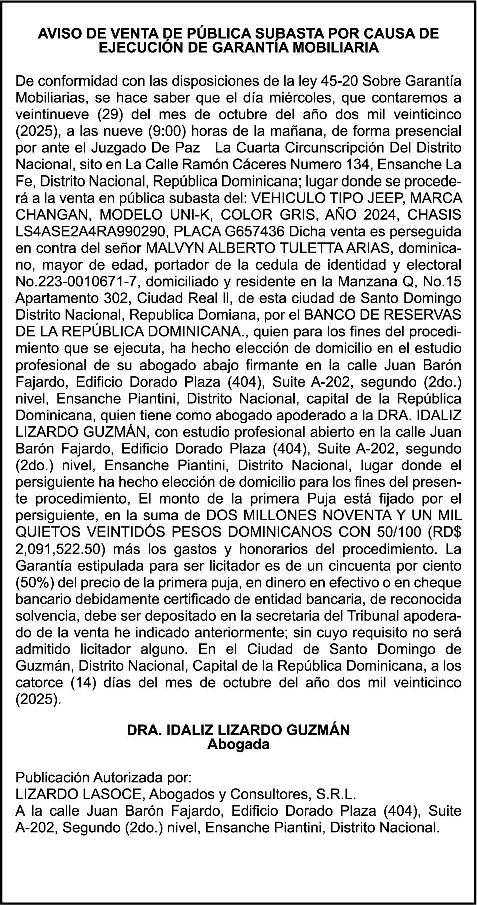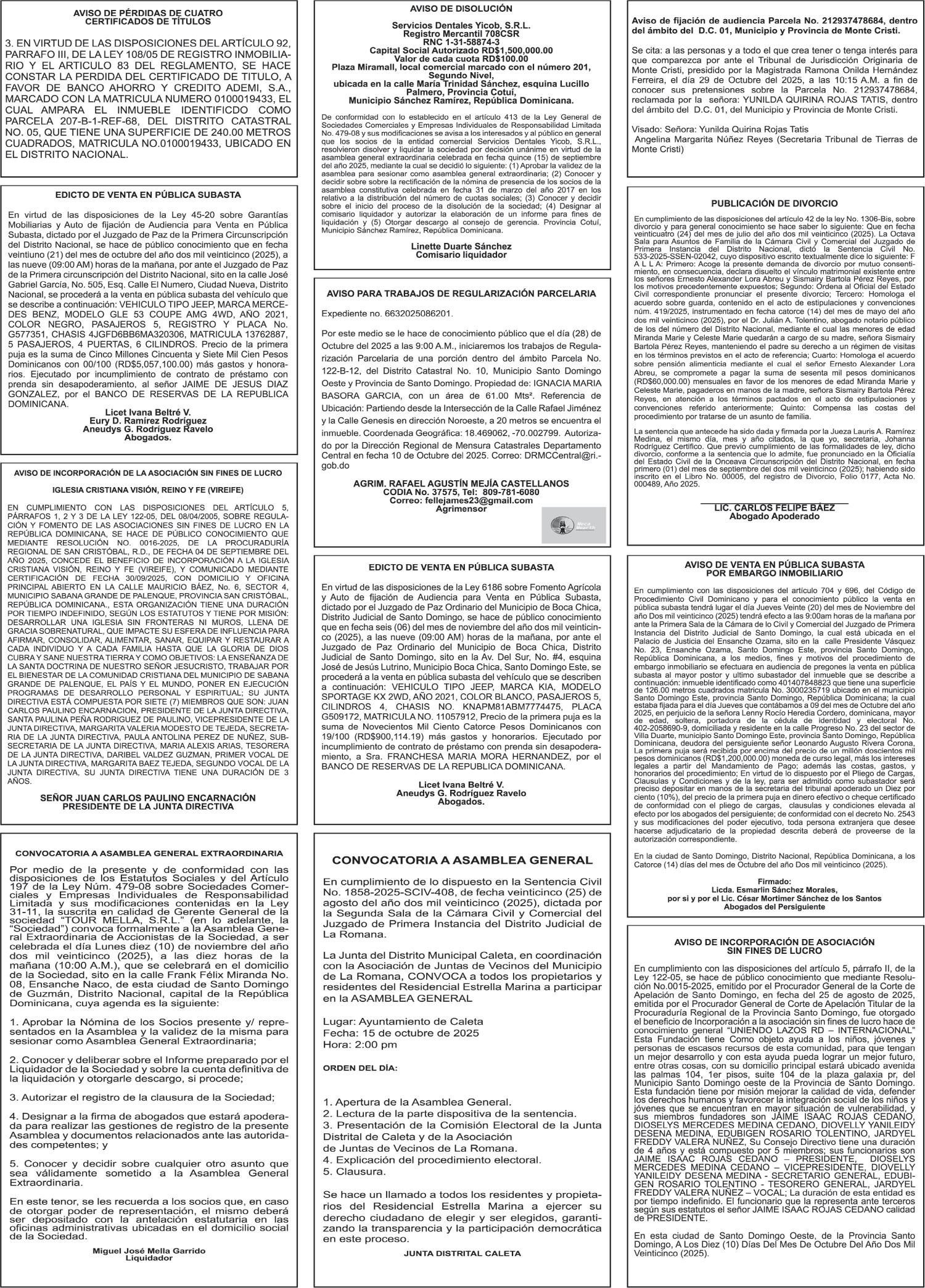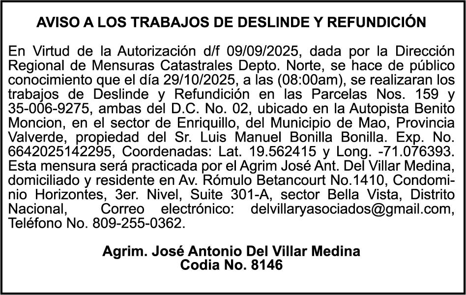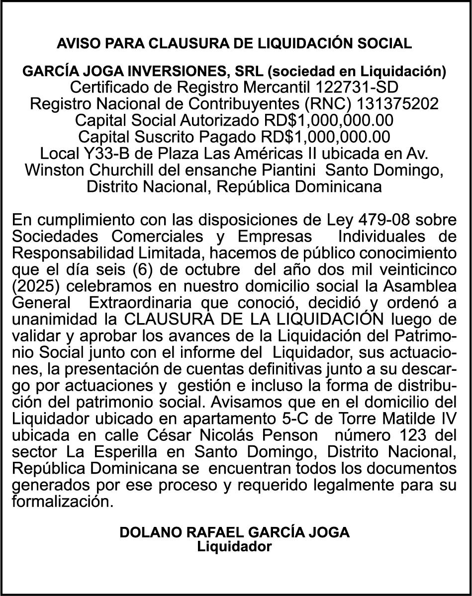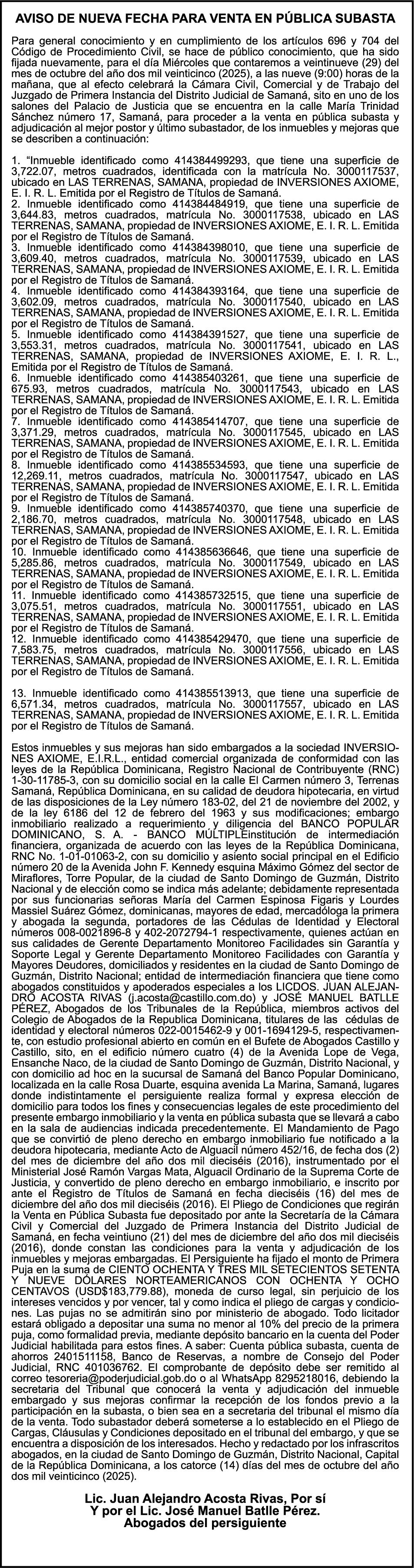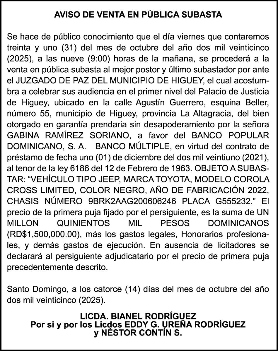 PERDIDA DE MATRICULA Veh. Carga MITSUBISHI, Modelo KO2TUNSLF, Color azul, Año 1989, Placa L165338, Chasis JA7FL24D6KP041332, a nombre de ALEJANDRO VASQUEZ SANTOS. SE hace de público conocimiento la pérdida del Certificado Financiero número 844150433 emitido por Banco Popular Dominicano, S. A. Banco Múltiple, a nombre de EXTALIN ABREU ANGELES, portador de la Cédula de Identidad y Electoral número 001-1316371-1, certificado número 844150433 expedido en 16 de septiembre de 2024 por el monto de (RD$6,192,907.53) más intereses generados a la fecha.