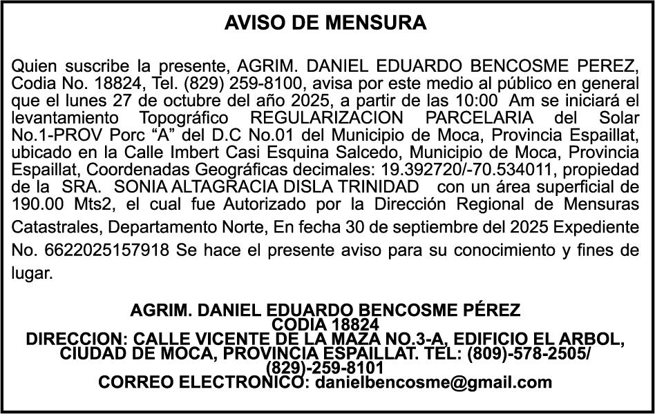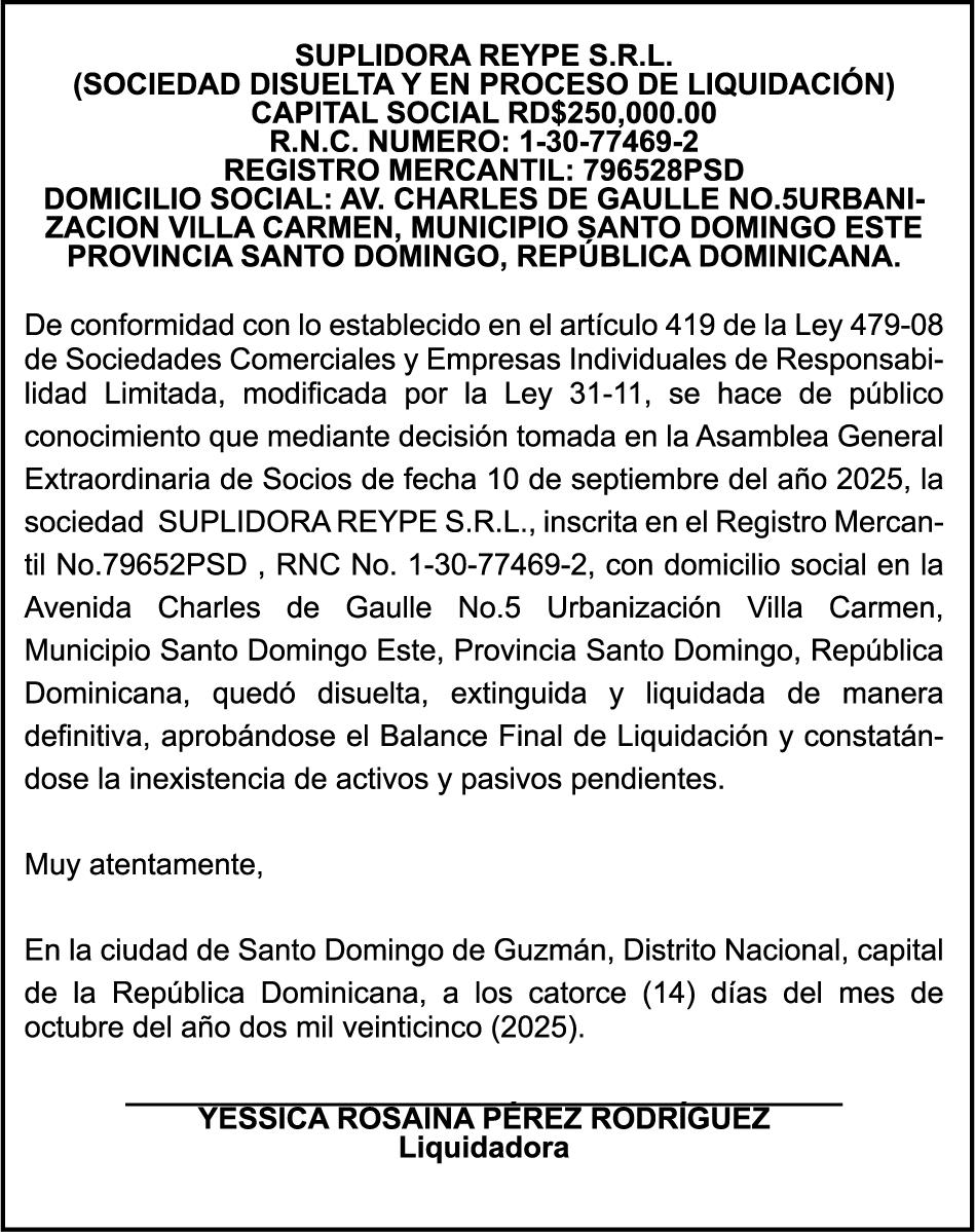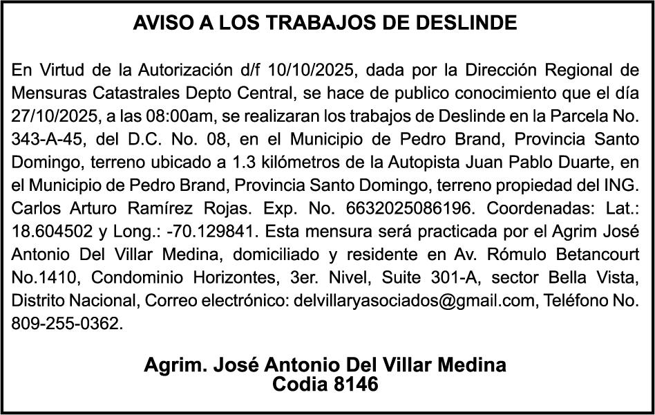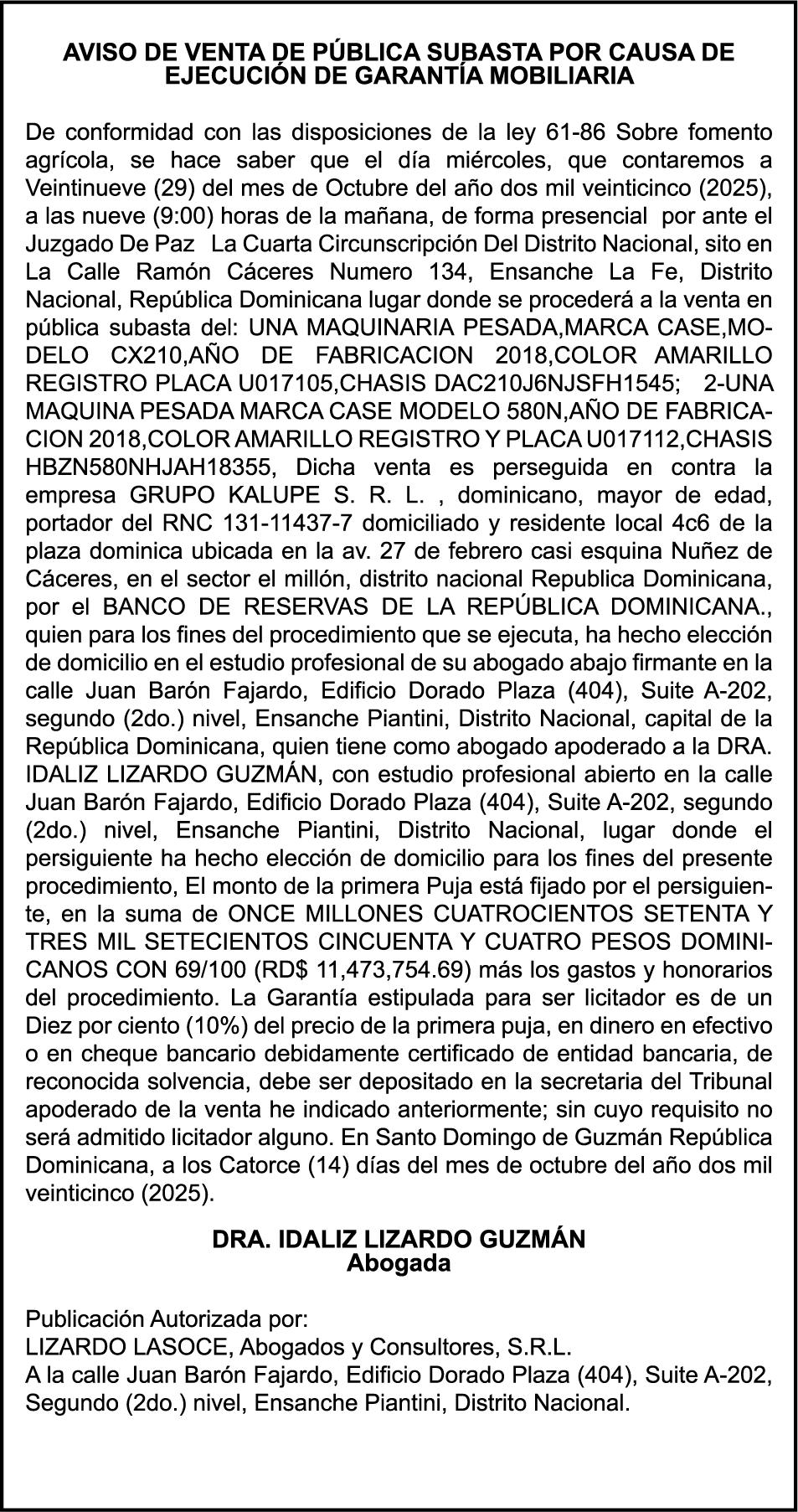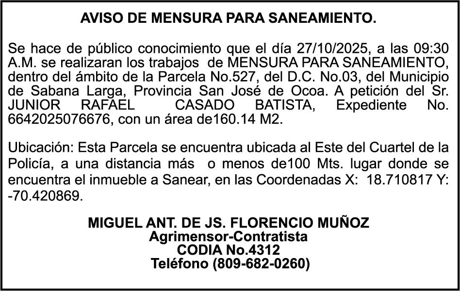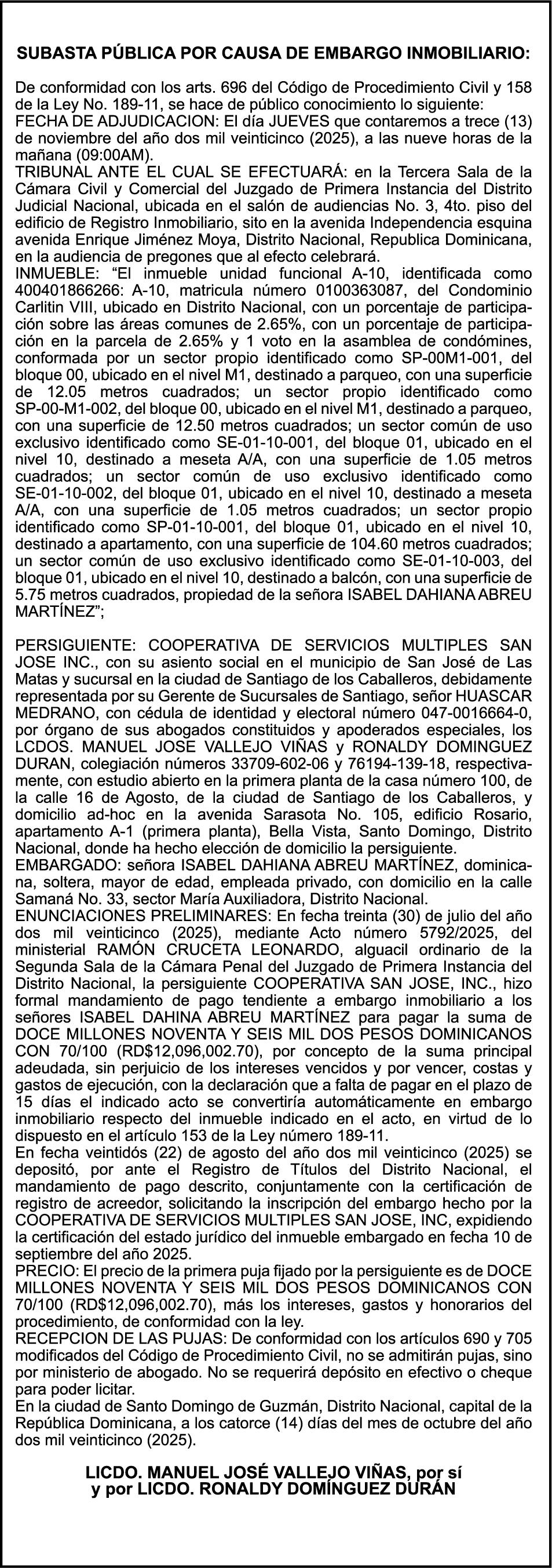 PERDIDA DE MATRICULA Veh. Carga MITSUBISHI, Modelo KO2TUNSLF, Color azul, Año 1989, Placa L165338, Chasis JA7FL24D6KP041332, a nombre de ALEJANDRO VASQUEZ SANTOS. SE hace de público conocimiento la pérdida del Certificado Financiero número 844150433 emitido por Banco Popular Dominicano, S. A. Banco Múltiple, a nombre de EXTALIN ABREU ANGELES, portador de la Cédula de Identidad y Electoral número 001-1316371-1, certificado número 844150433 expedido en 16 de septiembre de 2024 por el monto de (RD$6,192,907.53) más intereses generados a la fecha.