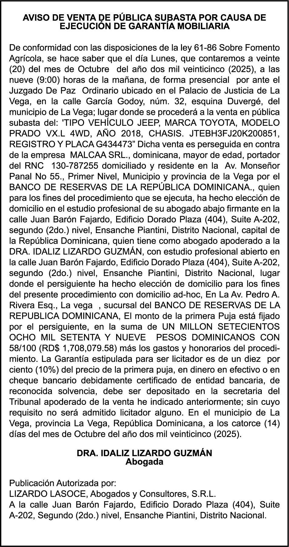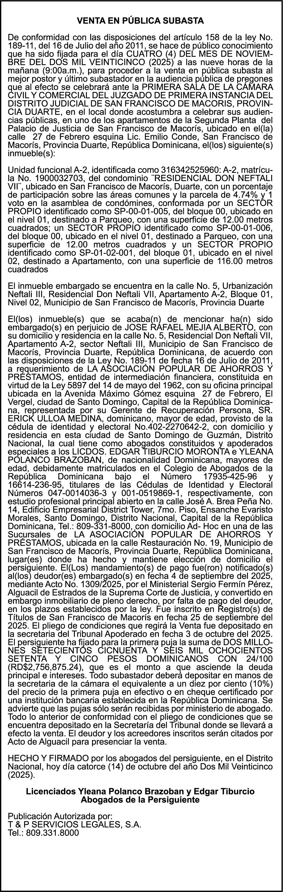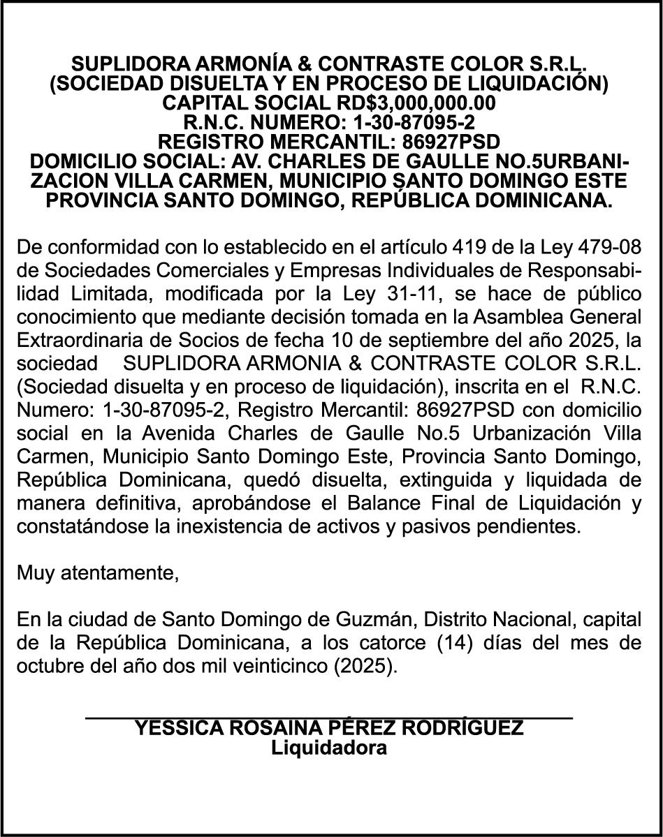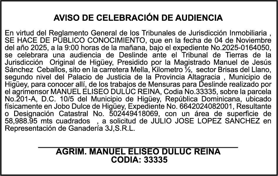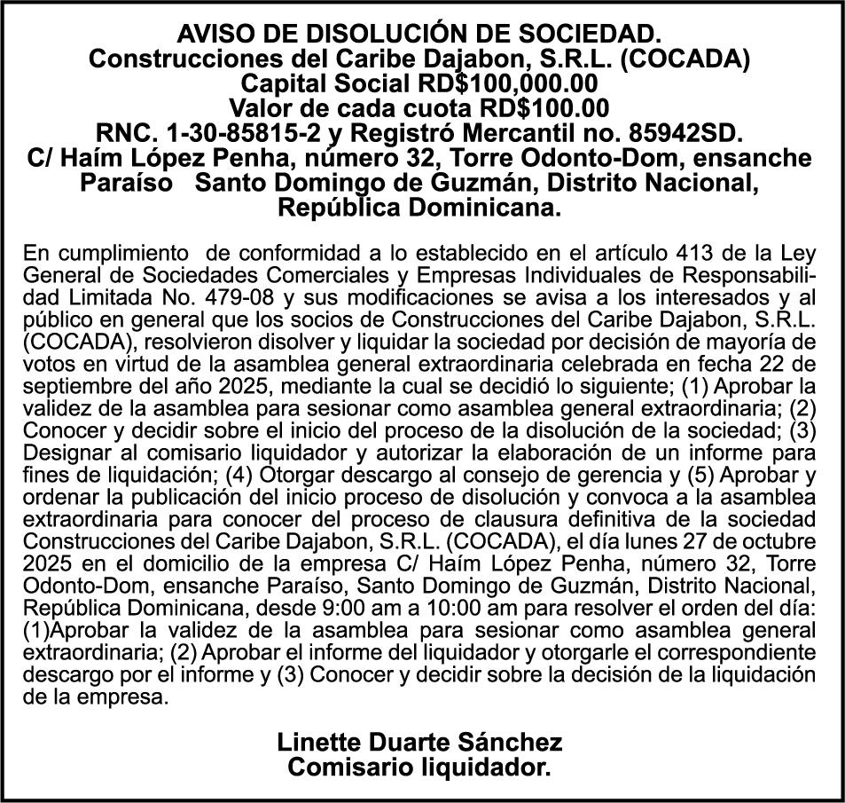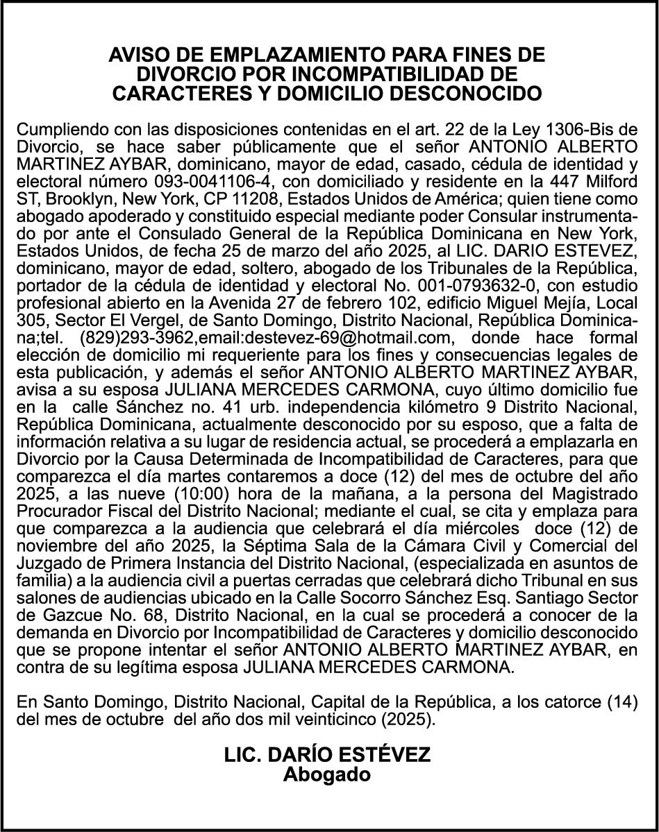 PERDIDA DE MATRICULA Veh. Carga MITSUBISHI, Modelo KO2TUNSLF, Color azul, Año 1989, Placa L165338, Chasis JA7FL24D6KP041332, a nombre de ALEJANDRO VASQUEZ SANTOS. SE hace de público conocimiento la pérdida del Certificado Financiero número 844150433 emitido por Banco Popular Dominicano, S. A. Banco Múltiple, a nombre de EXTALIN ABREU ANGELES, portador de la Cédula de Identidad y Electoral número 001-1316371-1, certificado número 844150433 expedido en 16 de septiembre de 2024 por el monto de (RD$6,192,907.53) más intereses generados a la fecha.