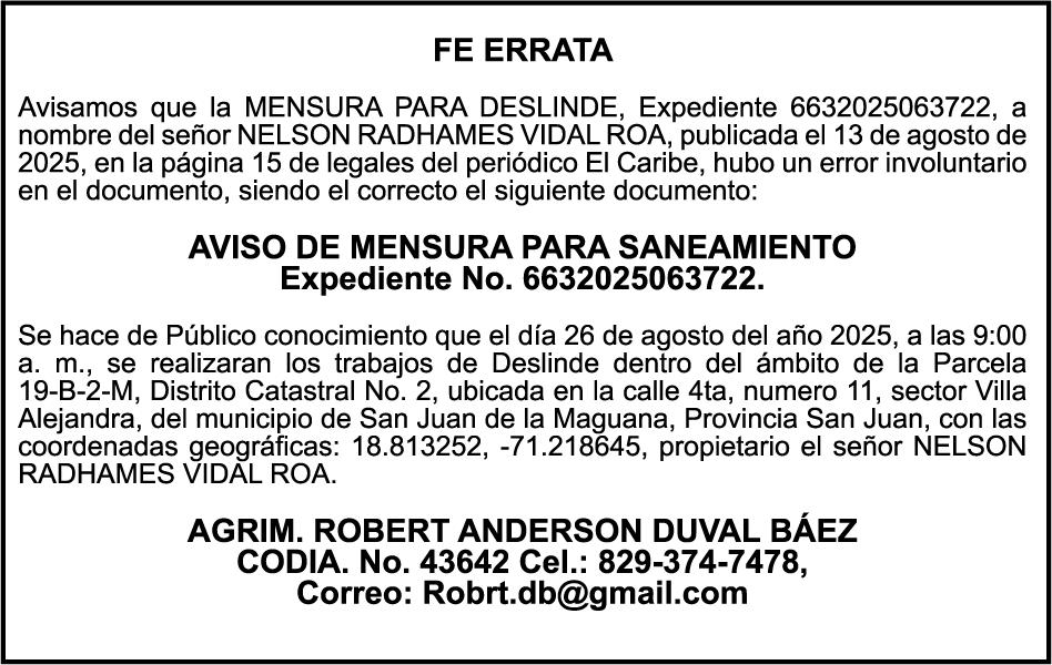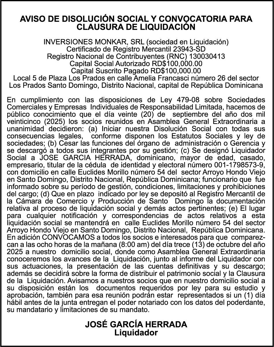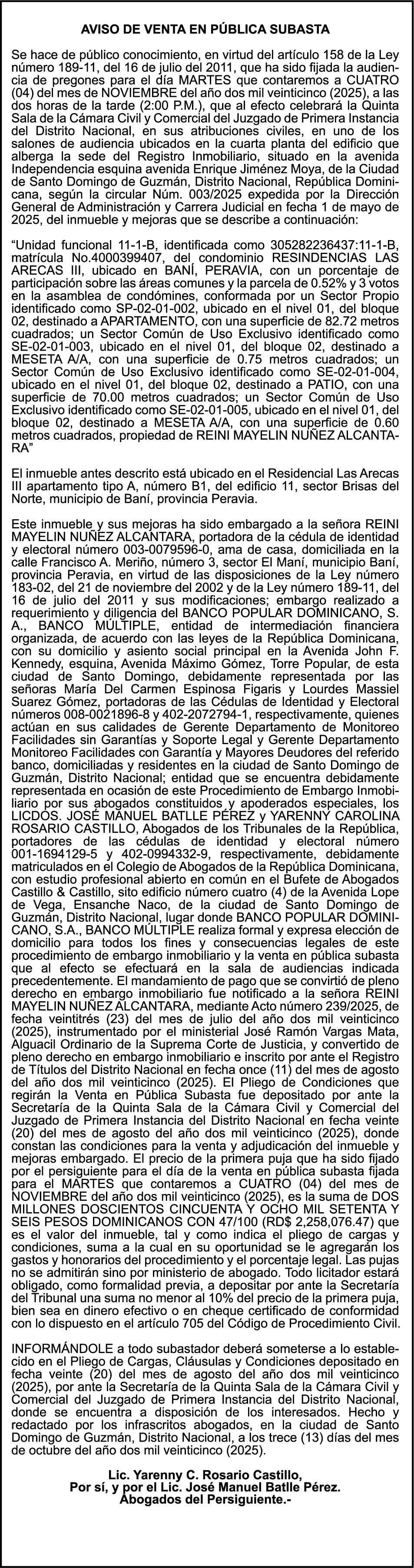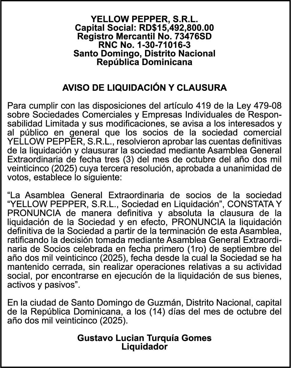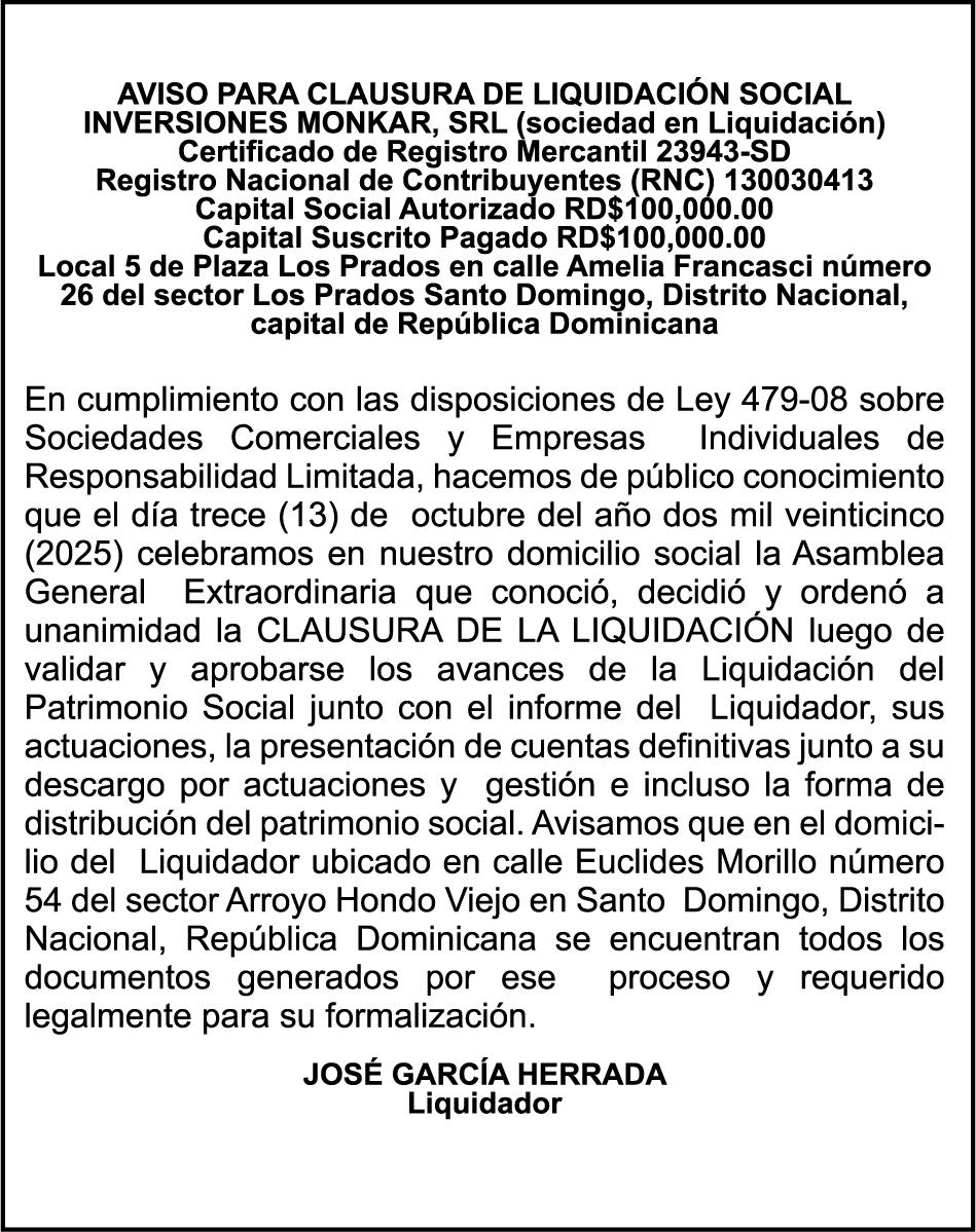 PERDIDA DE MATRICULA Veh. Carga MITSUBISHI, Modelo KO2TUNSLF, Color azul, Año 1989, Placa L165338, Chasis JA7FL24D6KP041332, a nombre de ALEJANDRO VASQUEZ SANTOS. SE hace de público conocimiento la pérdida del Certificado Financiero número 844150433 emitido por Banco Popular Dominicano, S. A. Banco Múltiple, a nombre de EXTALIN ABREU ANGELES, portador de la Cédula de Identidad y Electoral número 001-1316371-1, certificado número 844150433 expedido en 16 de septiembre de 2024 por el monto de (RD$6,192,907.53) más intereses generados a la fecha.