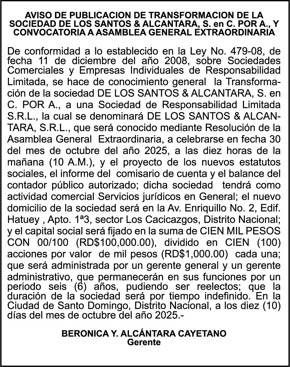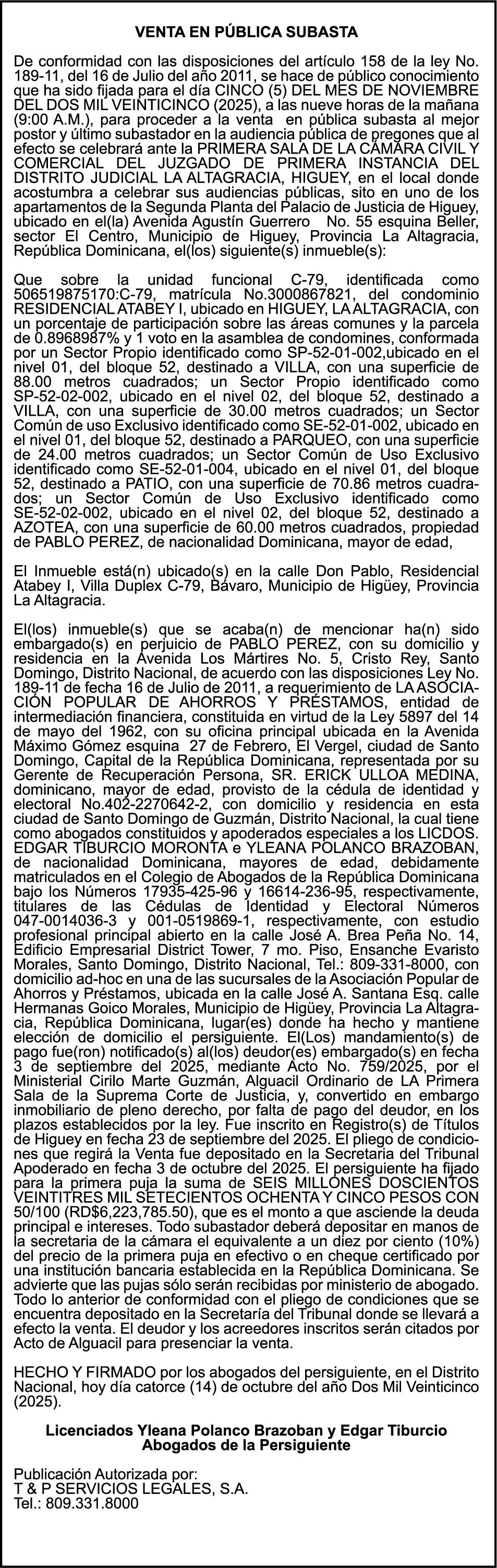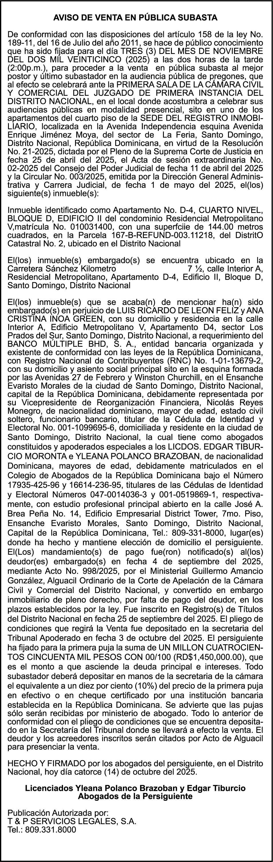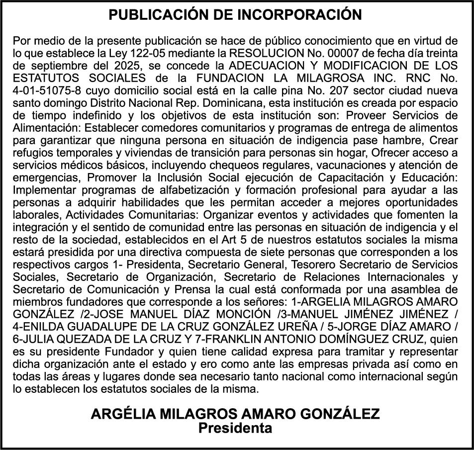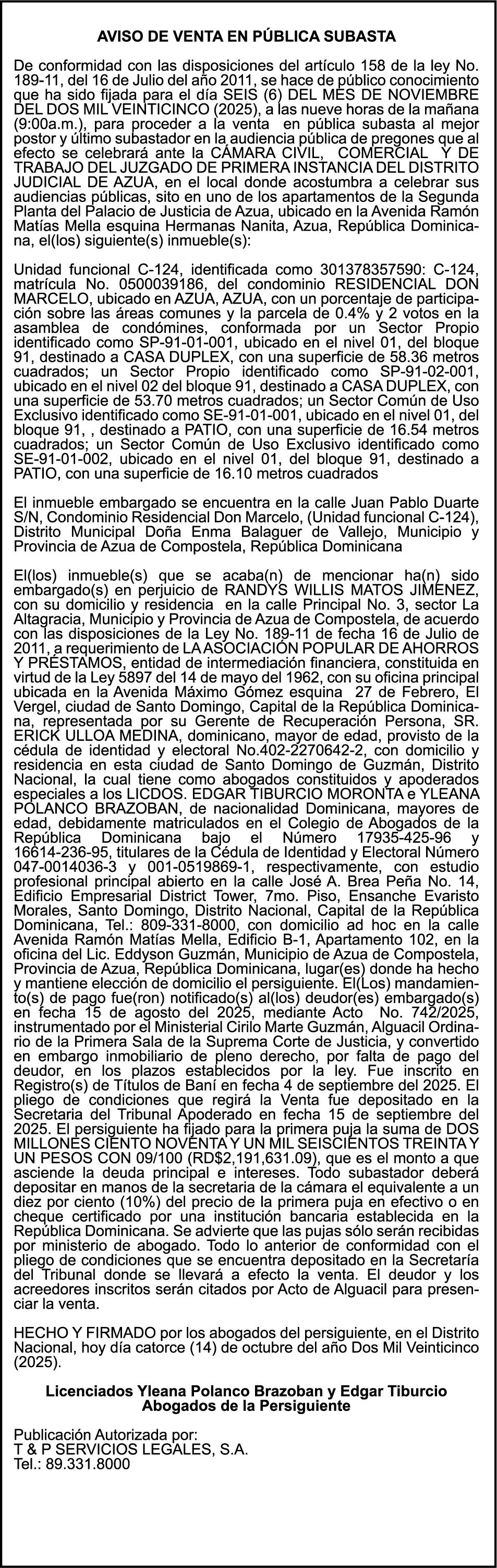 PERDIDA DE MATRICULA Veh. Carga MITSUBISHI, Modelo KO2TUNSLF, Color azul, Año 1989, Placa L165338, Chasis JA7FL24D6KP041332, a nombre de ALEJANDRO VASQUEZ SANTOS. SE hace de público conocimiento la pérdida del Certificado Financiero número 844150433 emitido por Banco Popular Dominicano, S. A. Banco Múltiple, a nombre de EXTALIN ABREU ANGELES, portador de la Cédula de Identidad y Electoral número 001-1316371-1, certificado número 844150433 expedido en 16 de septiembre de 2024 por el monto de (RD$6,192,907.53) más intereses generados a la fecha.