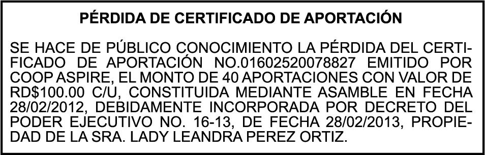 SE hace de público conocimiento la pérdida del Certificado Financiero número 841626542 emitido por Banco Popular Dominicano, S. A. Banco Múltiple, a nombre de DILIANNY PAMELA NUÑEZ CRUZ, portadora de la Cédula de Identidad y Electoral número 402-0904433-4, certificado número 841626542 expedido en fecha 24 de mayo de 2024 por el monto de (RD$137,700.05) más intereses generados a la fecha.