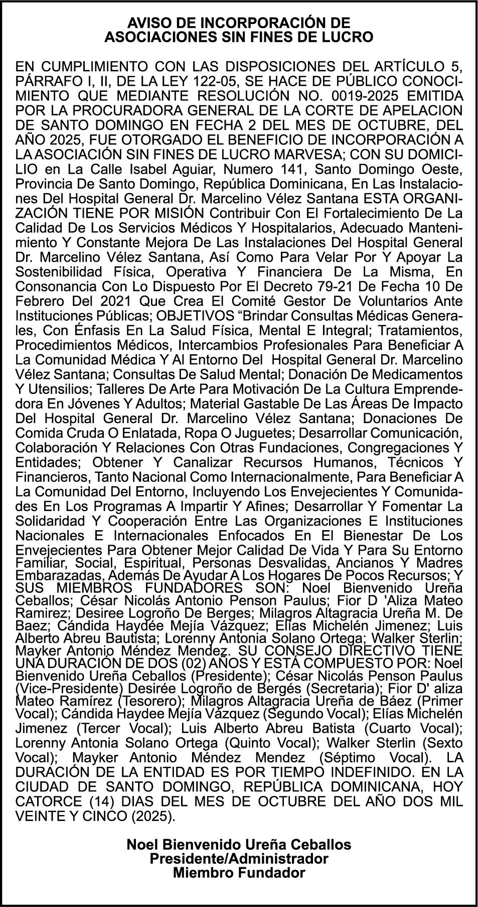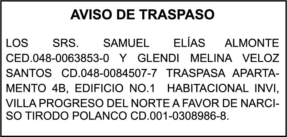 AVISO: perdida de permiso de Construcción.Se hace de público conocimiento la perdida del permiso de construcción No. 128-2023 cosco No. SBW15C23Z925-6, de 38 pies de eslora, en favor de la Cia. SBW CONSTRUCCTIONS,S.R.L.