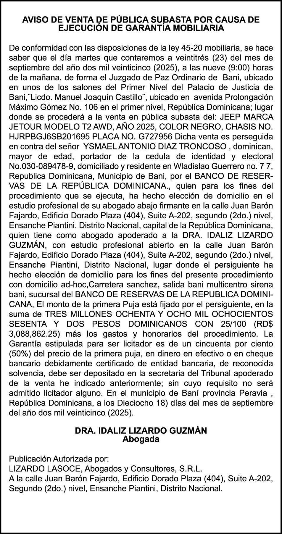 PERDIDA DE MATRICULA Automóvil Privado HYUNDAI, modelo SONATA N20, color blanco, año 2012, placa A782207, chasis KMHEU41MBCA823527, a nombre de BISQUEYLI MERCEDES TIRADO SANTANA. PERDIDA DE PLACA.NO.G466128,Chasis 1C4RJFJG8FC716350,Marca JEEP,Modelo GRAND CHEROKEE SUMMIT 4WD,Color NEGRO,Año 2015,a nombre de ROSA JULIA RODRIGUEZ,ced.001-08319476