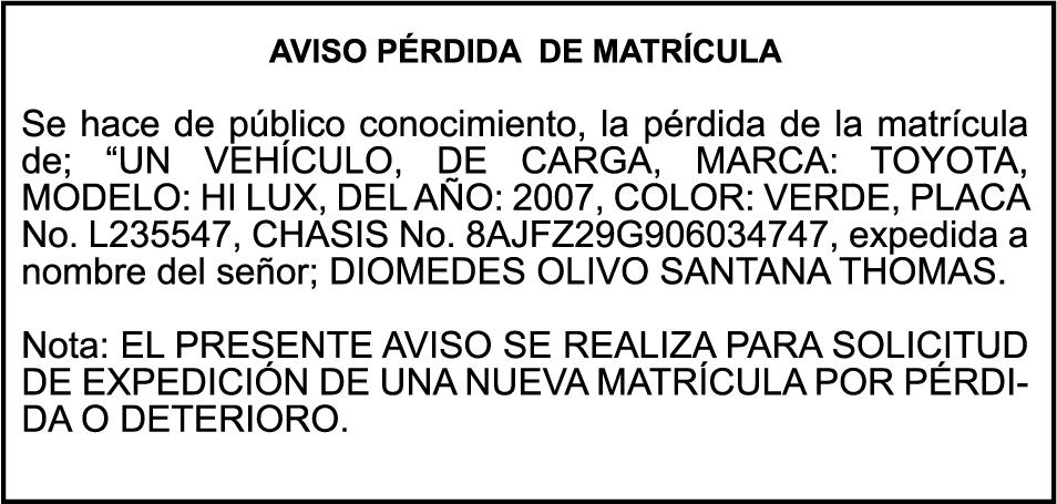 PERDIDA DE MATRICULA.Placa A660181,Chasis KNAGH415BAA404396,Marca KIA,Modelo LOTZE,Color BLANCO,Año 2010,a nombre de JOSE IGNACIO VASQUEZ POLANCO,Ced.031-0233554-8