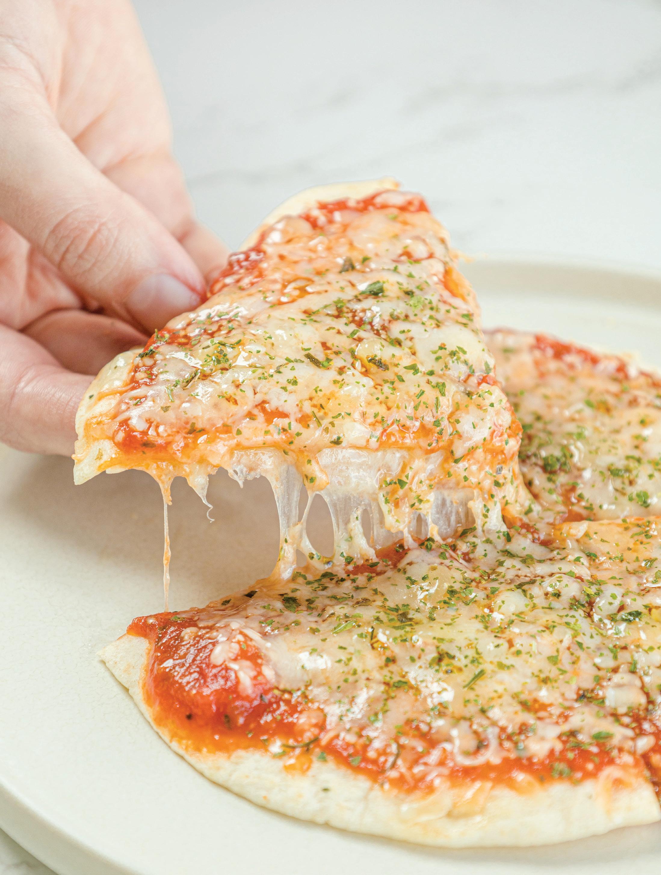 1 Colocar el queso mozzarella y el ajo en polvo sobre la tortilla y cubrir con otra tortilla. Agregar salsa de tomate encima, más mozzarella y los toppings de tu preferencia.