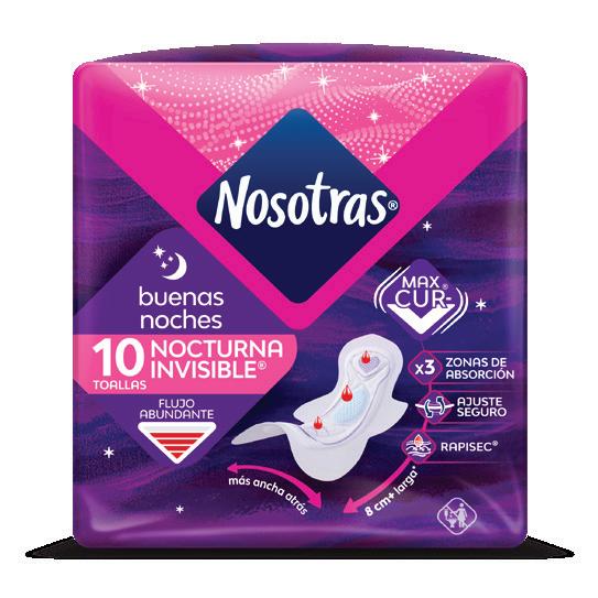 • Toallas Nosotras® Buenas Noches Invisible Rapisec: ideales para un flujo abundante ya que son 8 cm más largas y 40% más ancha atrás que una toalla normal. Además, tienen un ajuste perfecto que te permitirá moverte mientras duermes y así evitar accidentes. Lo mejor de todo es que con su cubierta Rapisec, el flujo se absorbe más rápido y podrás estar más limpia y seca.