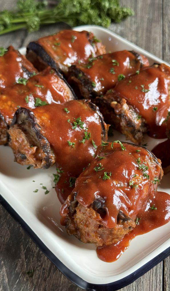 4 Toma una lonja de berenjena, coloca una porción de la mezcla de carne en un extremo y enrolla. Engrasa una bandeja para horno con Aceite La Joya, coloca los roletines uno al lado del otro, tapa con papel aluminio y hornea por 40 minutos a 350 °F (175 °C).