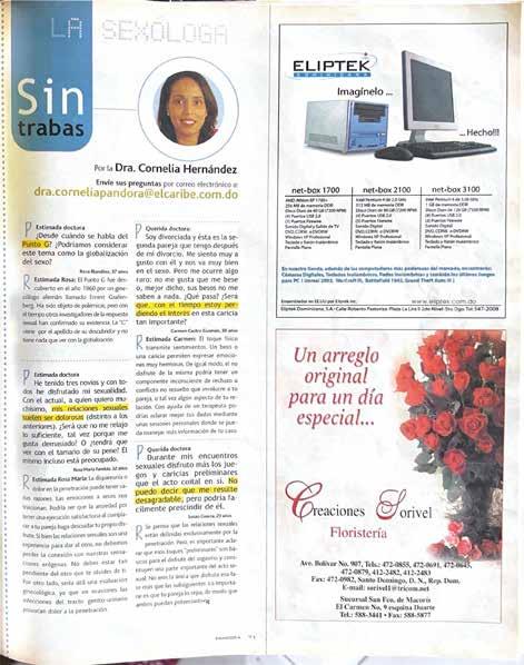 EL CARIBE. Departamento de Revistas. T: 809.683.8504. Fax: 809.683.8515. Dirección: Editora del Caribe. Calle Doctor Defilló No. 4, Los Prados, Santo Domingo, República Dominicana, Apartado Postal 416. Impresión: Editora Comercial del Caribe. Ventas Santiago: 809.489.3723/26/31. Publicidad: 809.683.8312/8301. info@pandora.com.do.