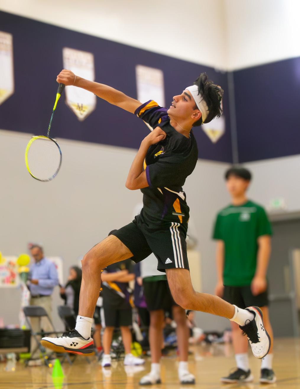 Junior Amish Tyagi jumps to hit an overhead shot in a match on Wednesday, April 23, where MVHS fell to Homestead High School 19-11.