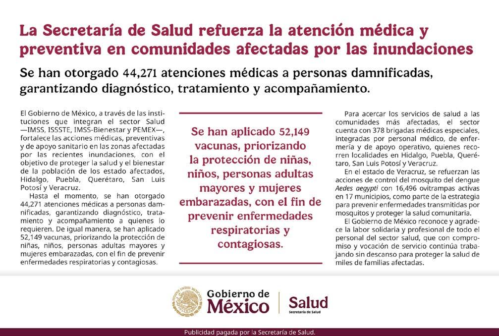 La CFE se ha abocado a reconectar la energía eléctrica; Infraestructura, Comunicaciones y Transportes, a restaurar caminos, carreteras y puentes; Defensa con los gobiernos de los estados, a establecer puentes aéreos; las instituciones de salud, a integrar brigadas médicas de vacunación, medicación, consulta y medidas de salubridad; Bienestar, a entregar alimentos; Economía, a tomar medidas para apoyar a los negocios afectados. Para poner algunos ejemplos.